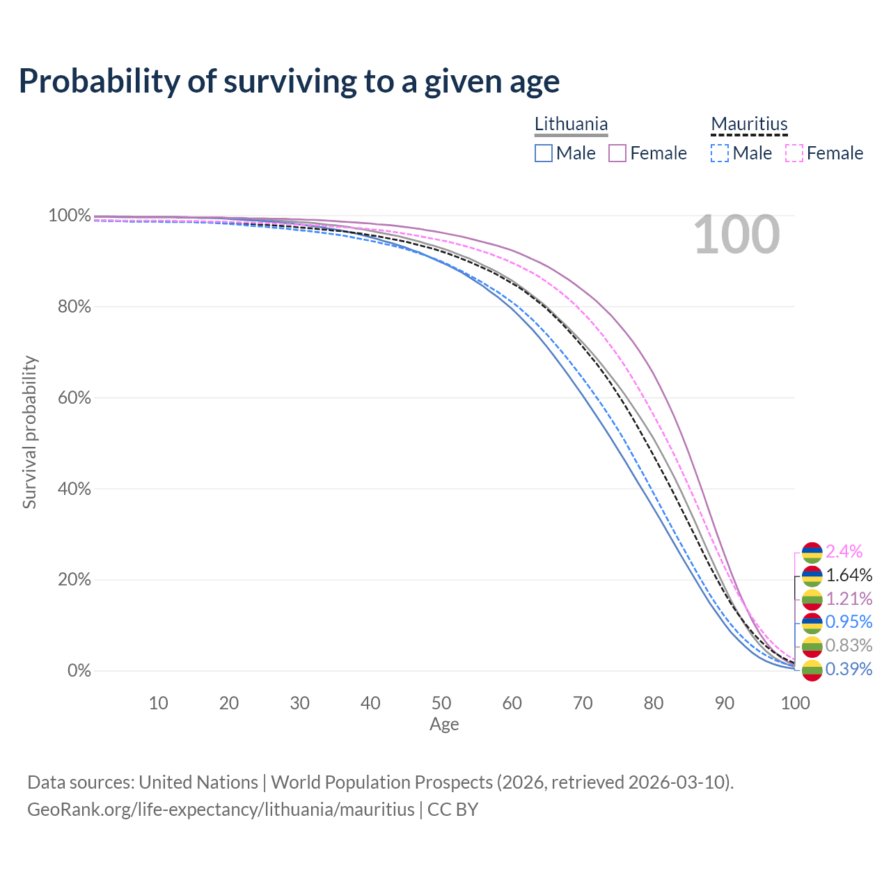 This life expectancy calculator shows the odds of living to 100, 95, 90, and below based on current age for both males and females in Lithuania and Mauritius, along with mean and median age of death. The calculations are based on the 2026 life tables (actuarial tables) from the UN World Population Prospects.