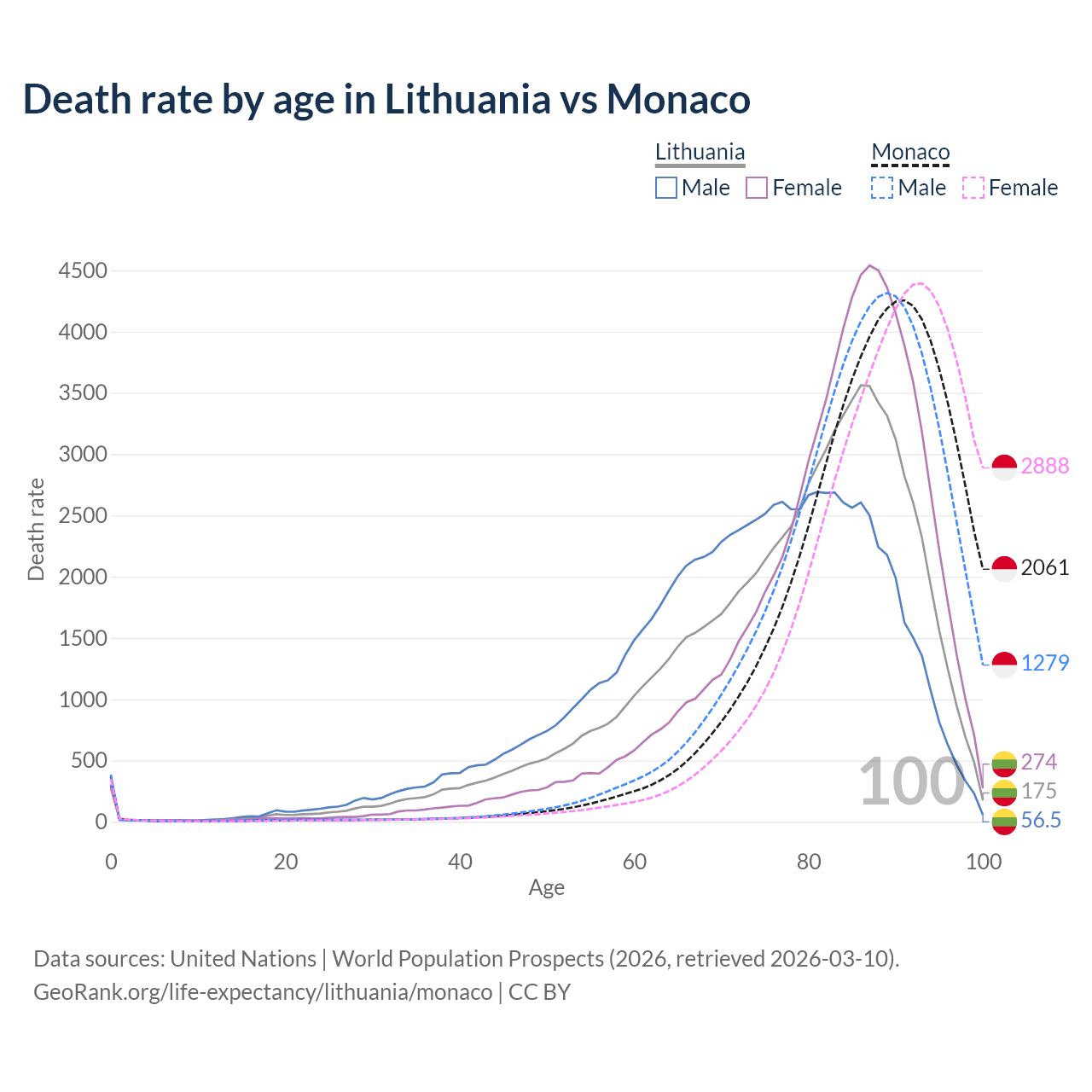 In Lithuania, the most common age of death is 86, compared to 91 in Monaco. The median age of death is 80.4 in Lithuania and 88.7 in Monaco, meaning only half of each cohort is expected to live past that age.