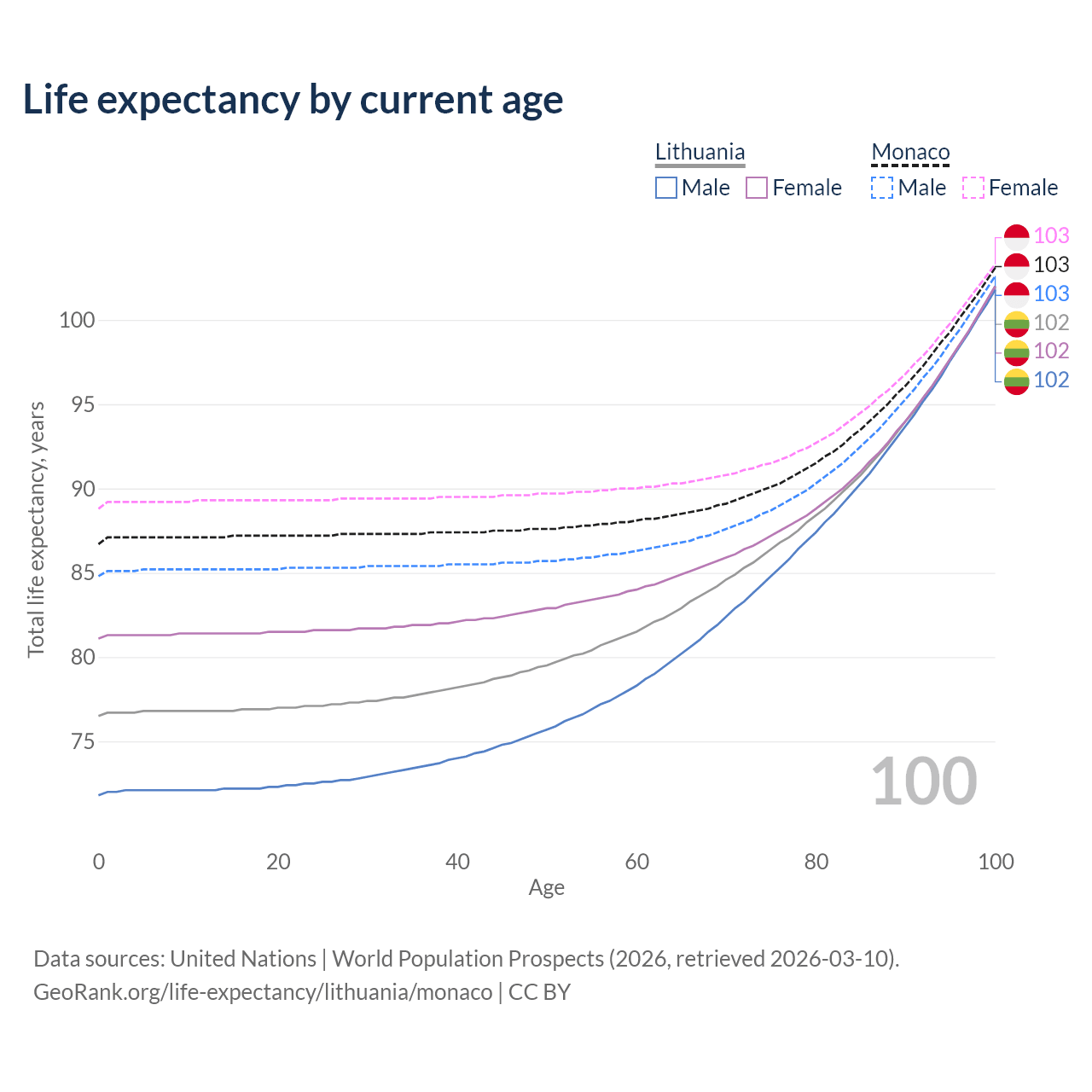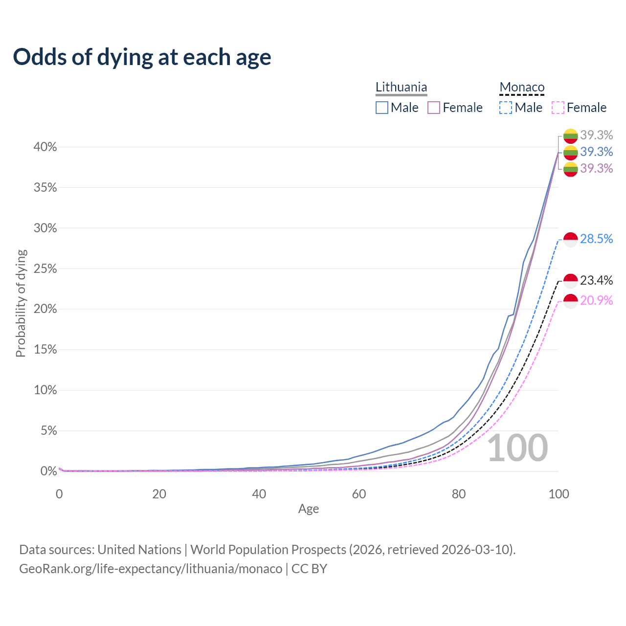 This life expectancy calculator shows the odds of living to 100, 95, 90, and below based on current age for both males and females in Lithuania and Monaco, along with mean and median age of death. The calculations are based on the 2026 life tables (actuarial tables) from the UN World Population Prospects.