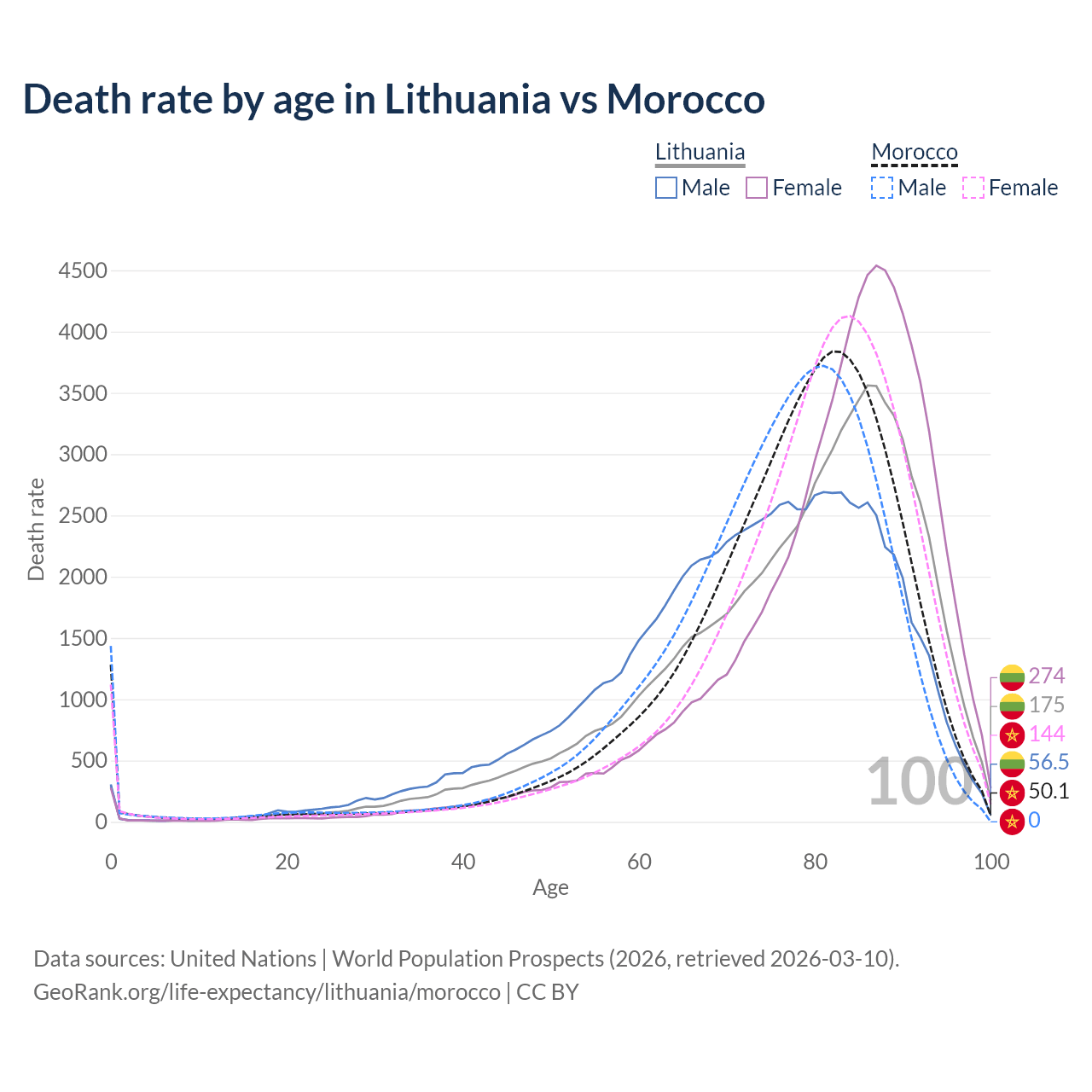This life expectancy calculator shows the odds of living to 100, 95, 90, and below based on current age for both males and females in Lithuania and Morocco, along with mean and median age of death. The calculations are based on the 2026 life tables (actuarial tables) from the UN World Population Prospects.