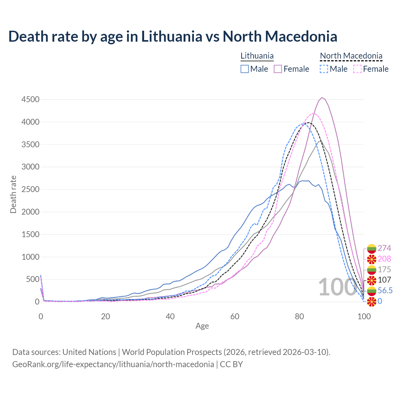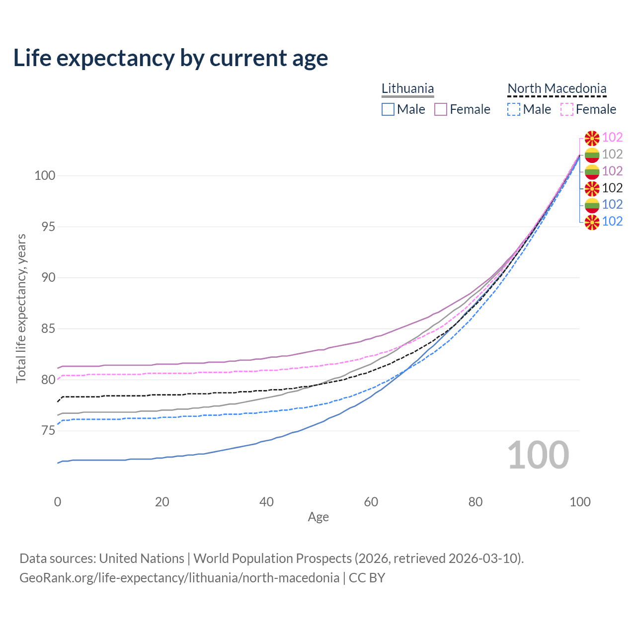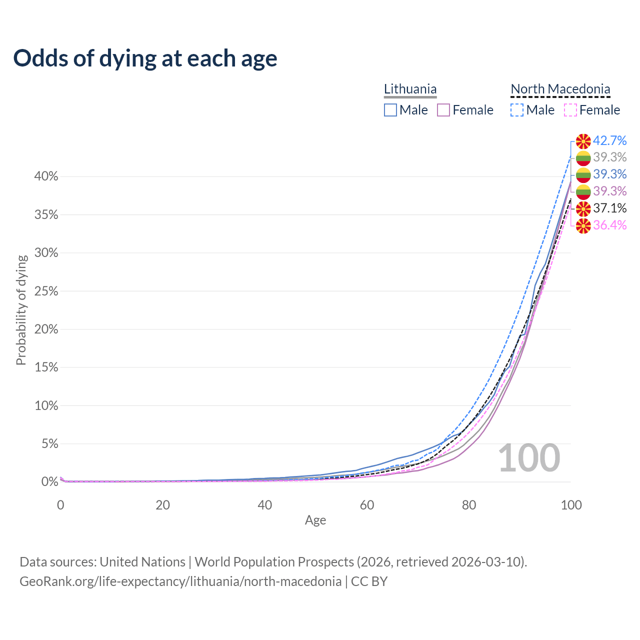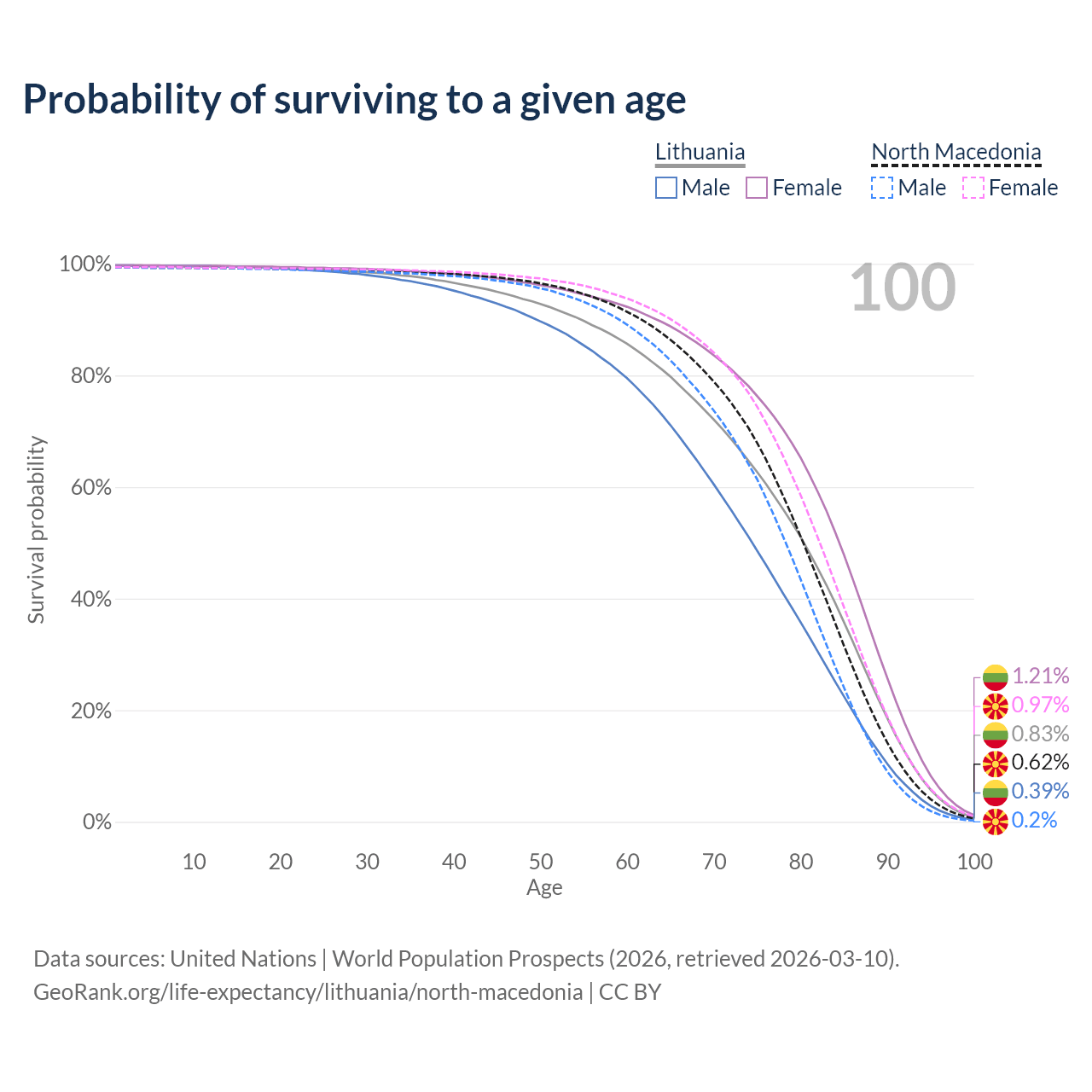 This life expectancy calculator shows the odds of living to 100, 95, 90, and below based on current age for both males and females in Lithuania and North Macedonia, along with mean and median age of death. The calculations are based on the 2026 life tables (actuarial tables) from the UN World Population Prospects.