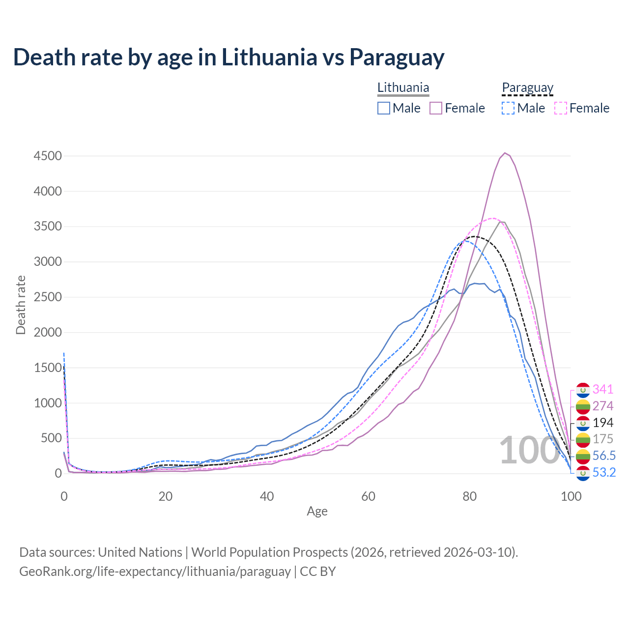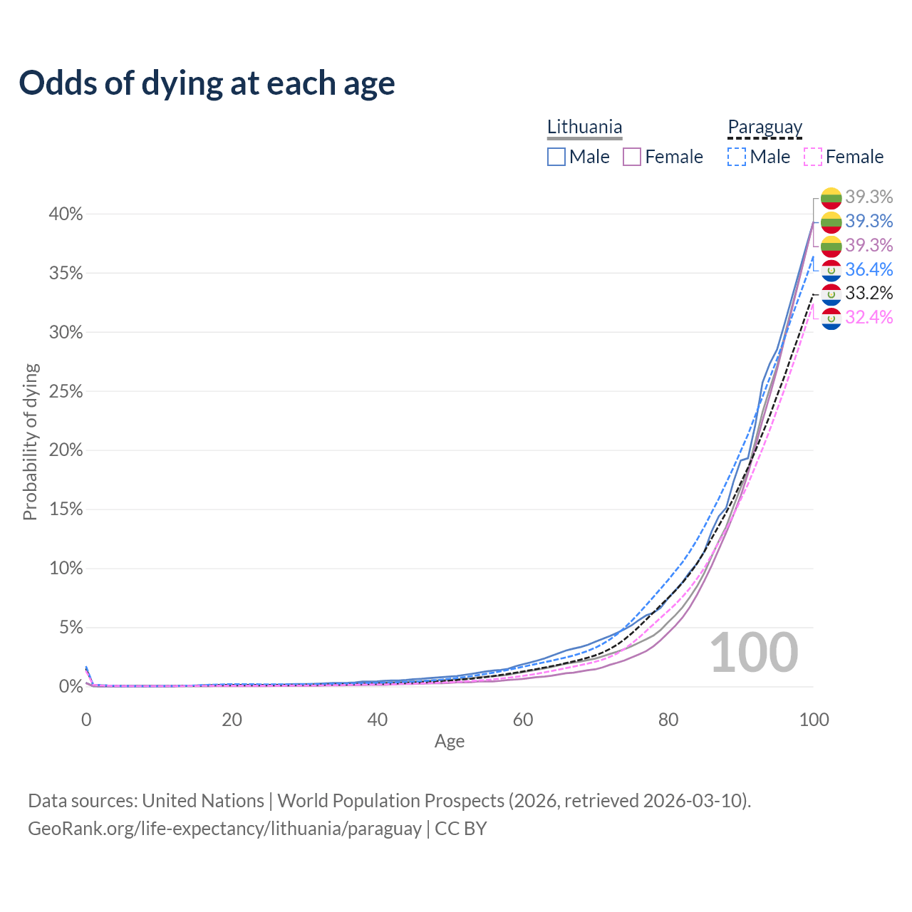 This life expectancy calculator shows the odds of living to 100, 95, 90, and below based on current age for both males and females in Lithuania and Paraguay, along with mean and median age of death. The calculations are based on the 2026 life tables (actuarial tables) from the UN World Population Prospects.
