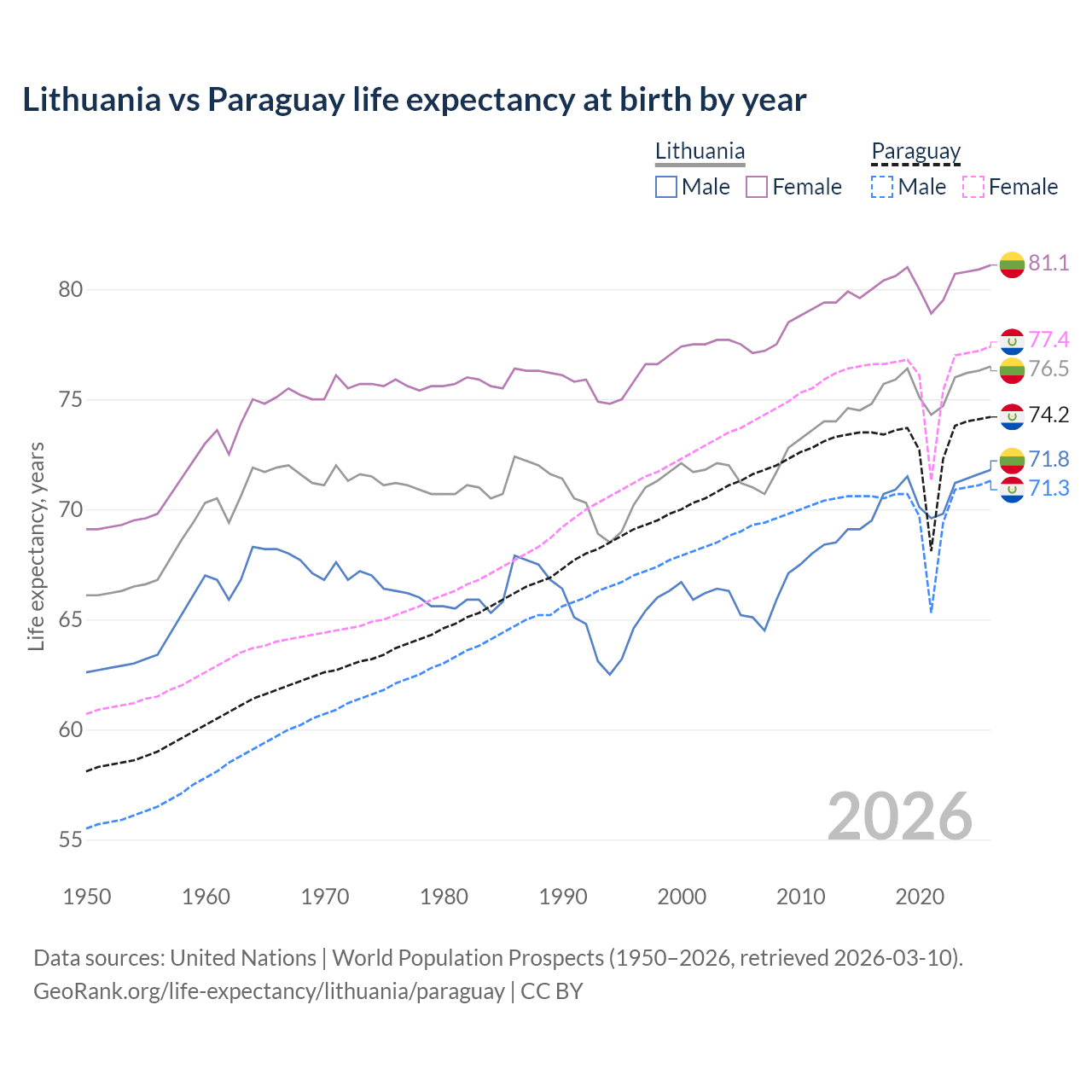 The average life expectancy at birth is 76.5 years in Lithuania vs 74.2 in Paraguay. Lithuania is ranked 80/197 by life expectancy, and Paraguay is 100/197. In Lithuania, the life expectancy is 71.8 years for males and 81.1 years for females. In Paraguay, it's 71.3 years for males and 77.4 years for females.