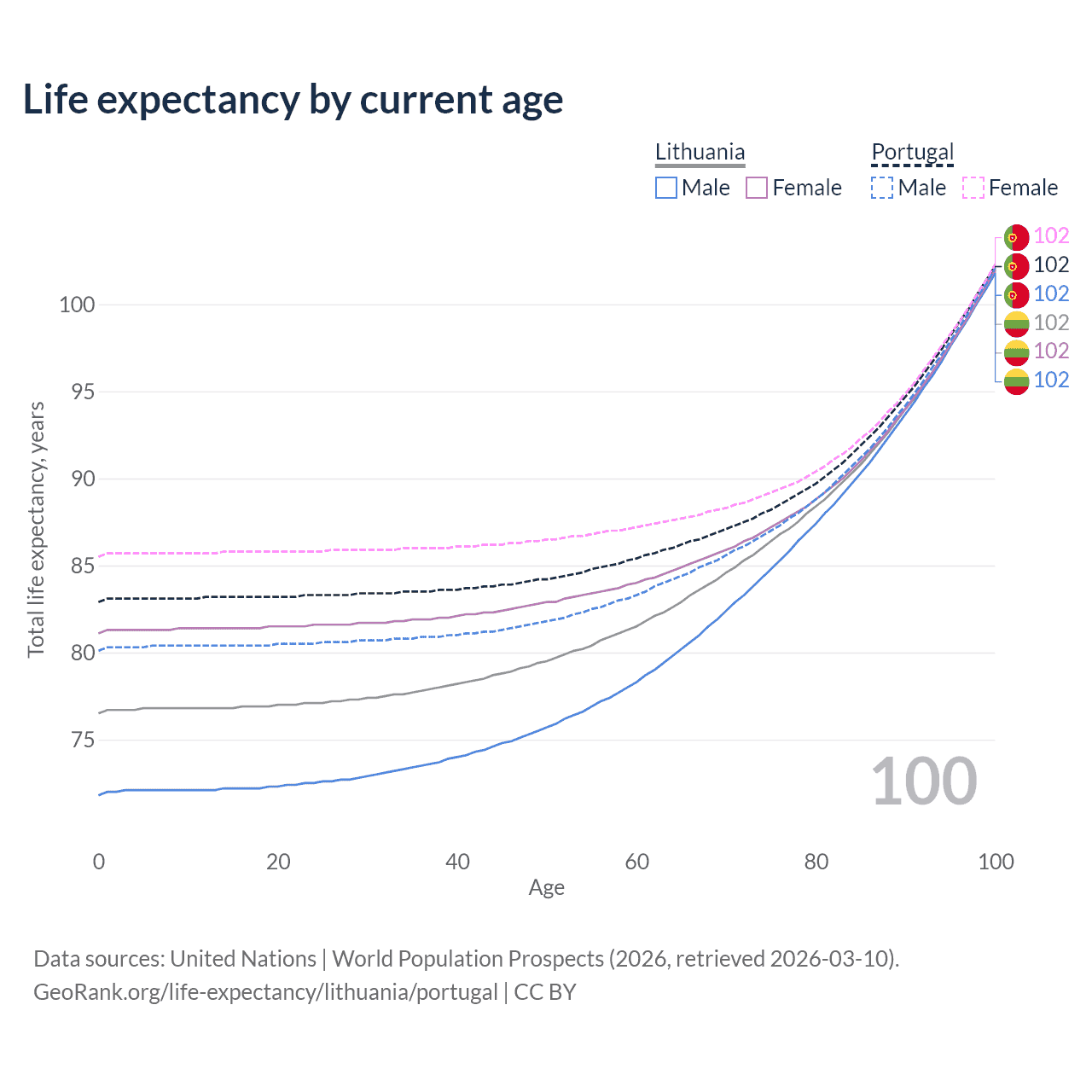 This life expectancy calculator shows the odds of living to 100, 95, 90, and below based on current age for both males and females in Lithuania and Portugal, along with mean and median age of death. The calculations are based on the 2026 life tables (actuarial tables) from the UN World Population Prospects.