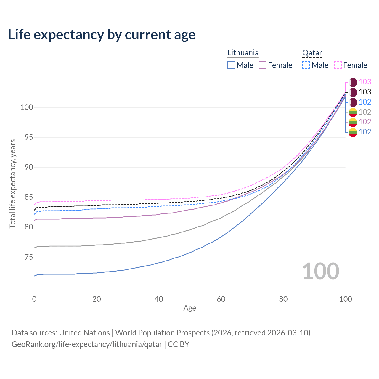 This life expectancy calculator shows the odds of living to 100, 95, 90, and below based on current age for both males and females in Lithuania and Qatar, along with mean and median age of death. The calculations are based on the 2026 life tables (actuarial tables) from the UN World Population Prospects.