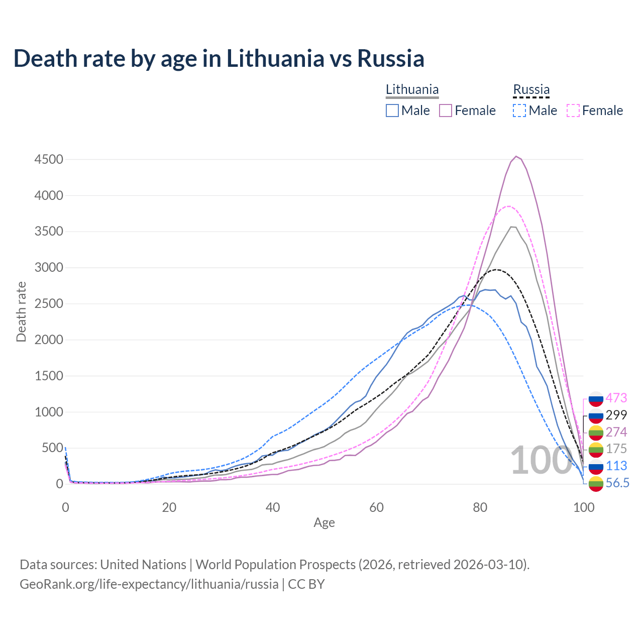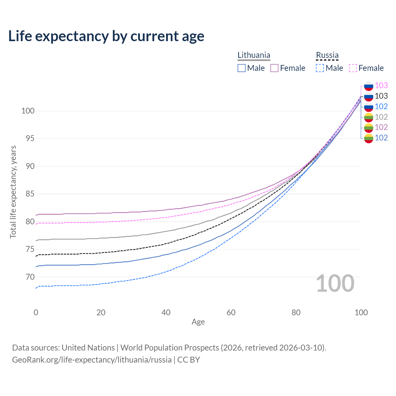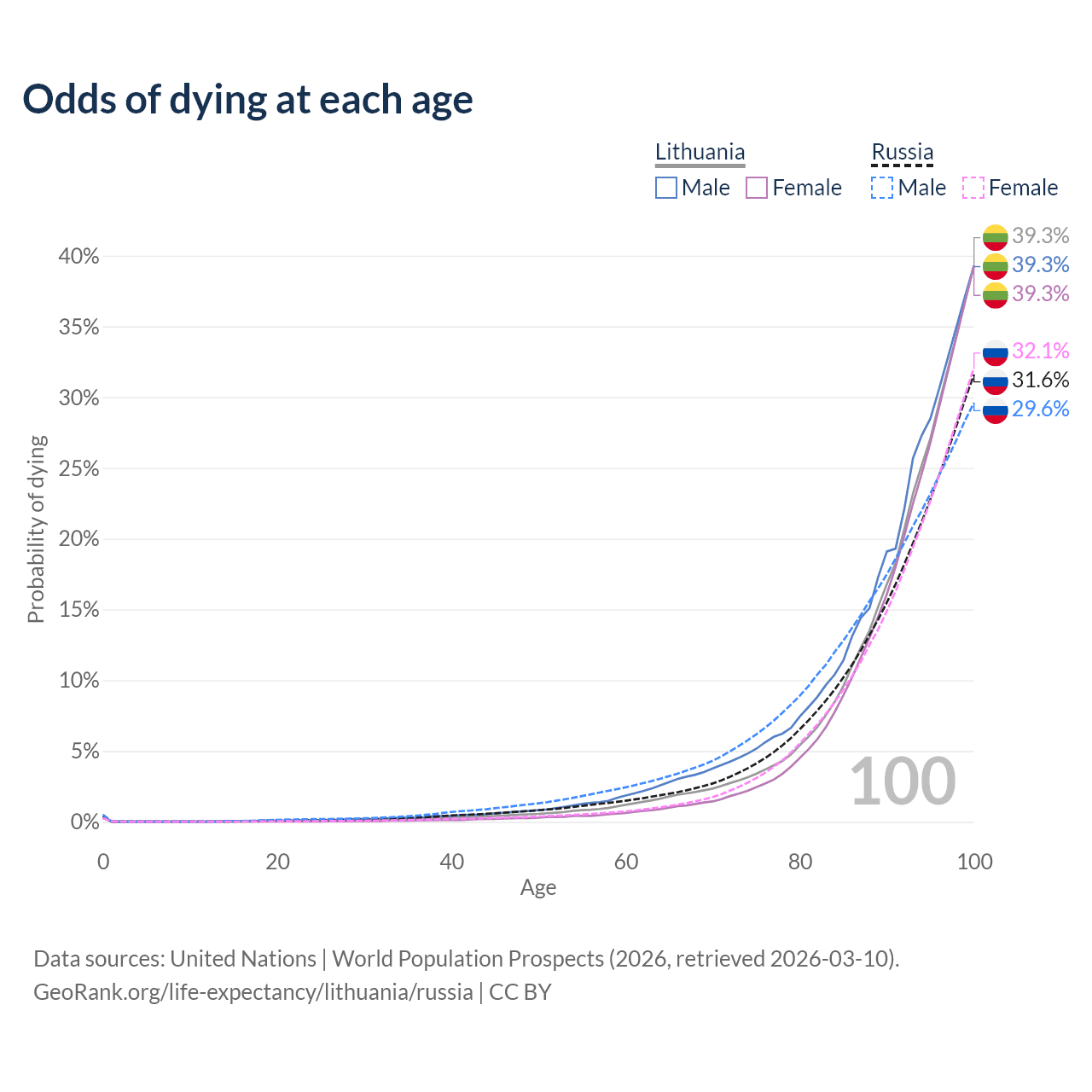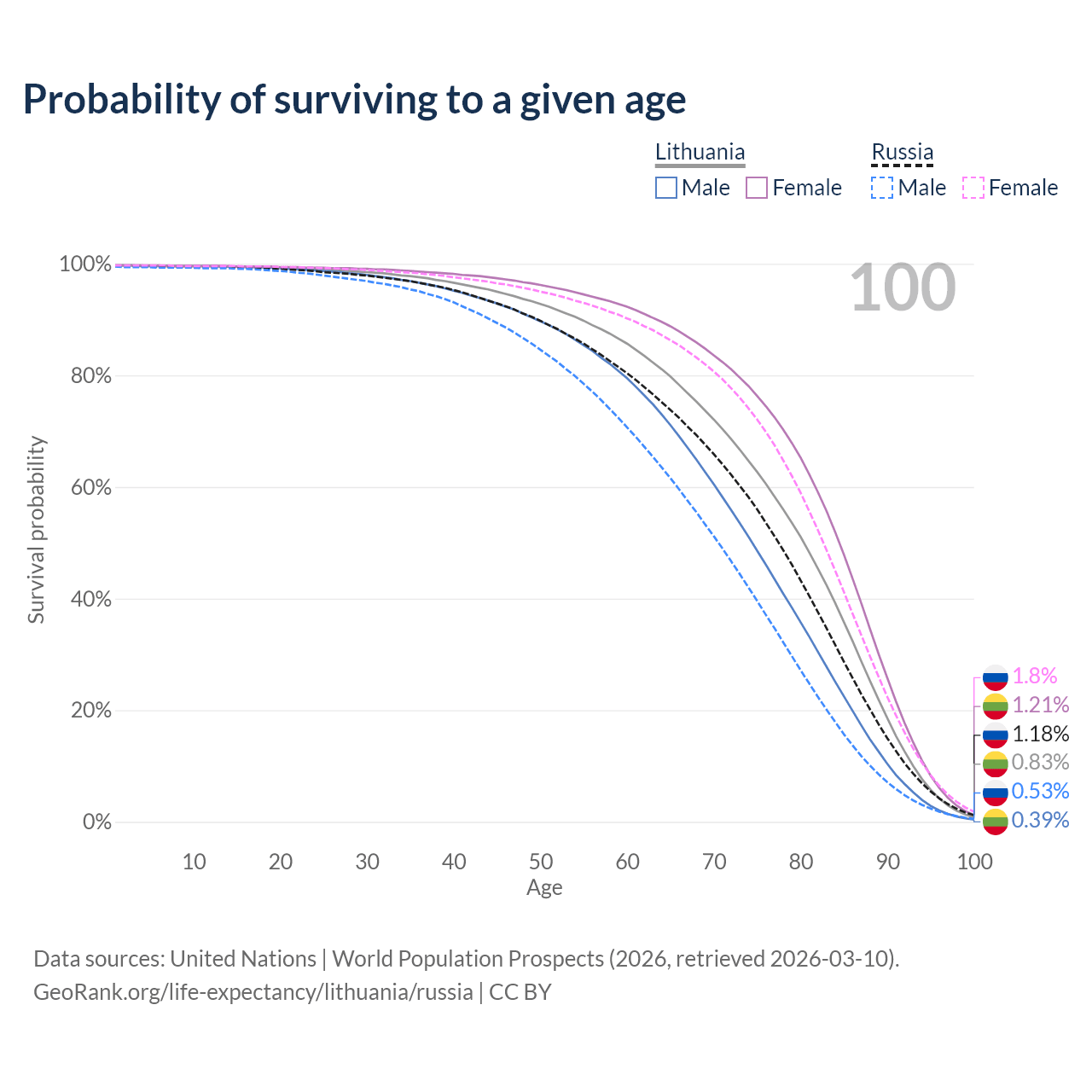 This life expectancy calculator shows the odds of living to 100, 95, 90, and below based on current age for both males and females in Lithuania and Russia, along with mean and median age of death. The calculations are based on the 2026 life tables (actuarial tables) from the UN World Population Prospects.