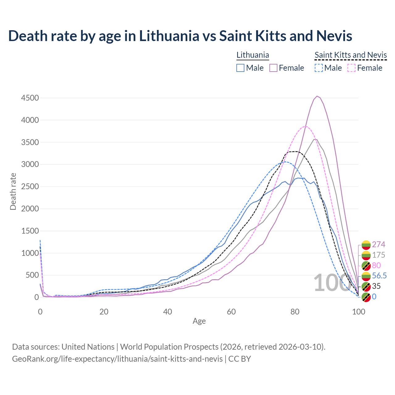 In Lithuania, the most common age of death is 86, compared to 80 in Saint Kitts and Nevis. The median age of death is 80.4 in Lithuania and 76.3 in Saint Kitts and Nevis, meaning only half of each cohort is expected to live past that age.
