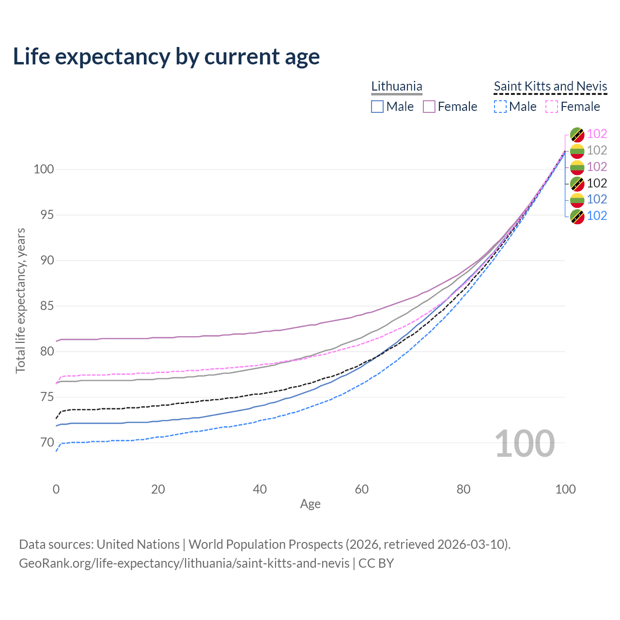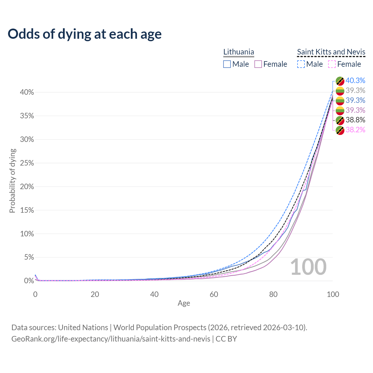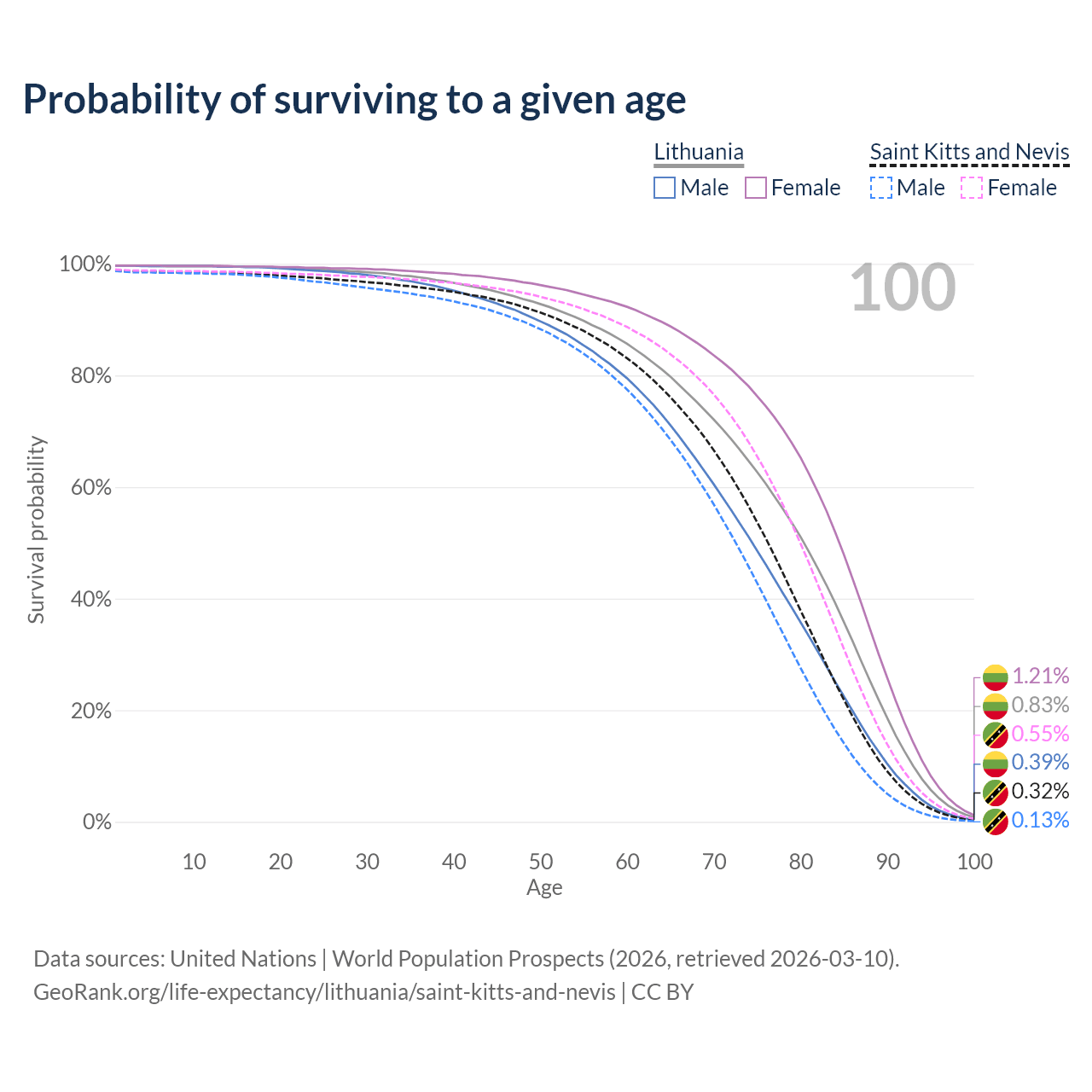 This life expectancy calculator shows the odds of living to 100, 95, 90, and below based on current age for both males and females in Lithuania and Saint Kitts and Nevis, along with mean and median age of death. The calculations are based on the 2026 life tables (actuarial tables) from the UN World Population Prospects.