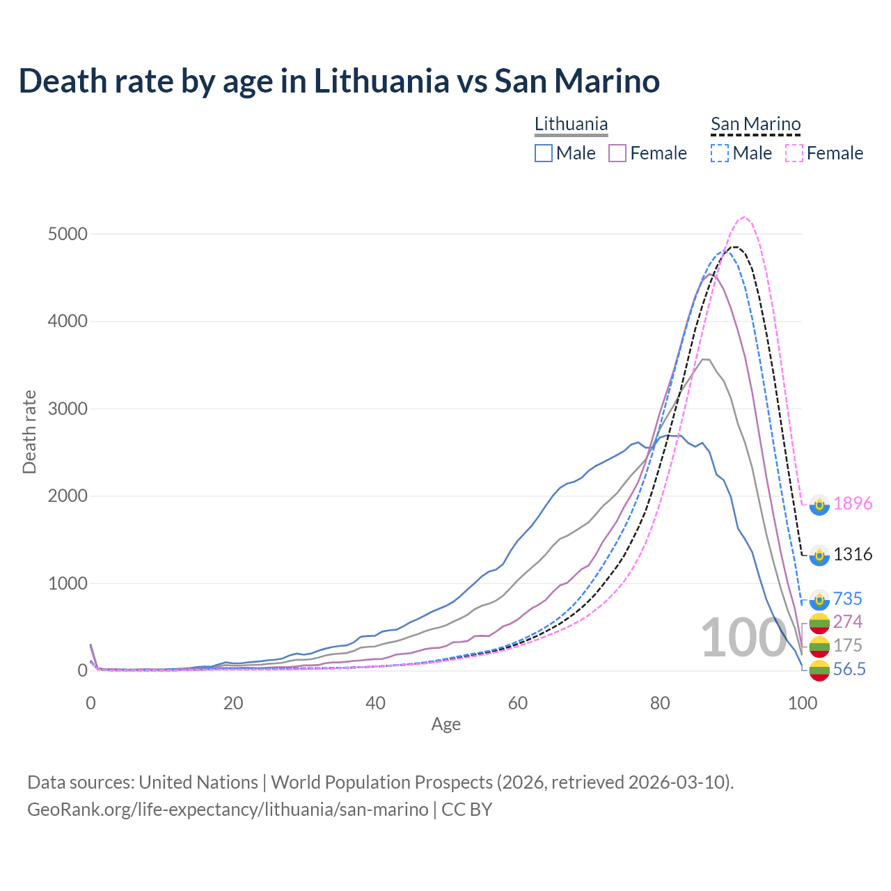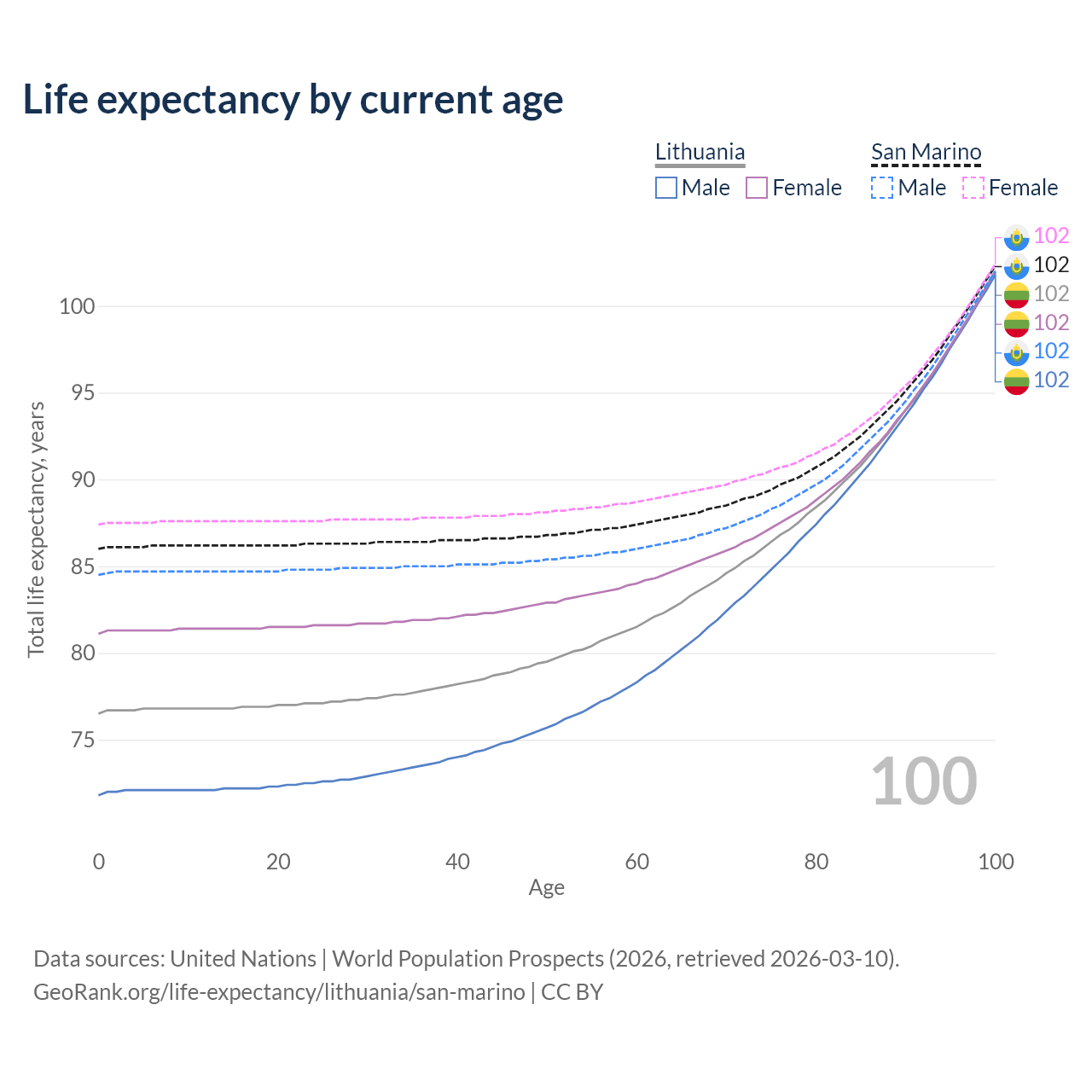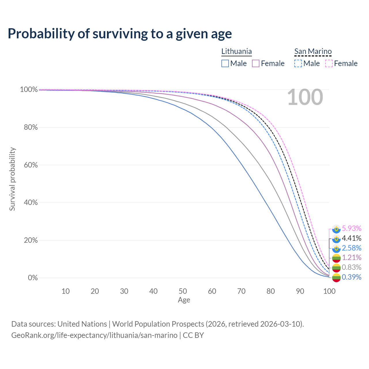 This life expectancy calculator shows the odds of living to 100, 95, 90, and below based on current age for both males and females in Lithuania and San Marino, along with mean and median age of death. The calculations are based on the 2026 life tables (actuarial tables) from the UN World Population Prospects.