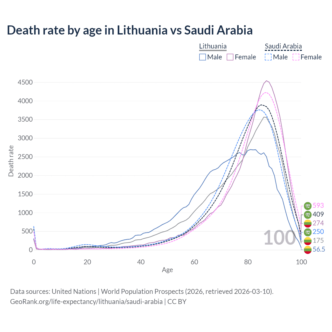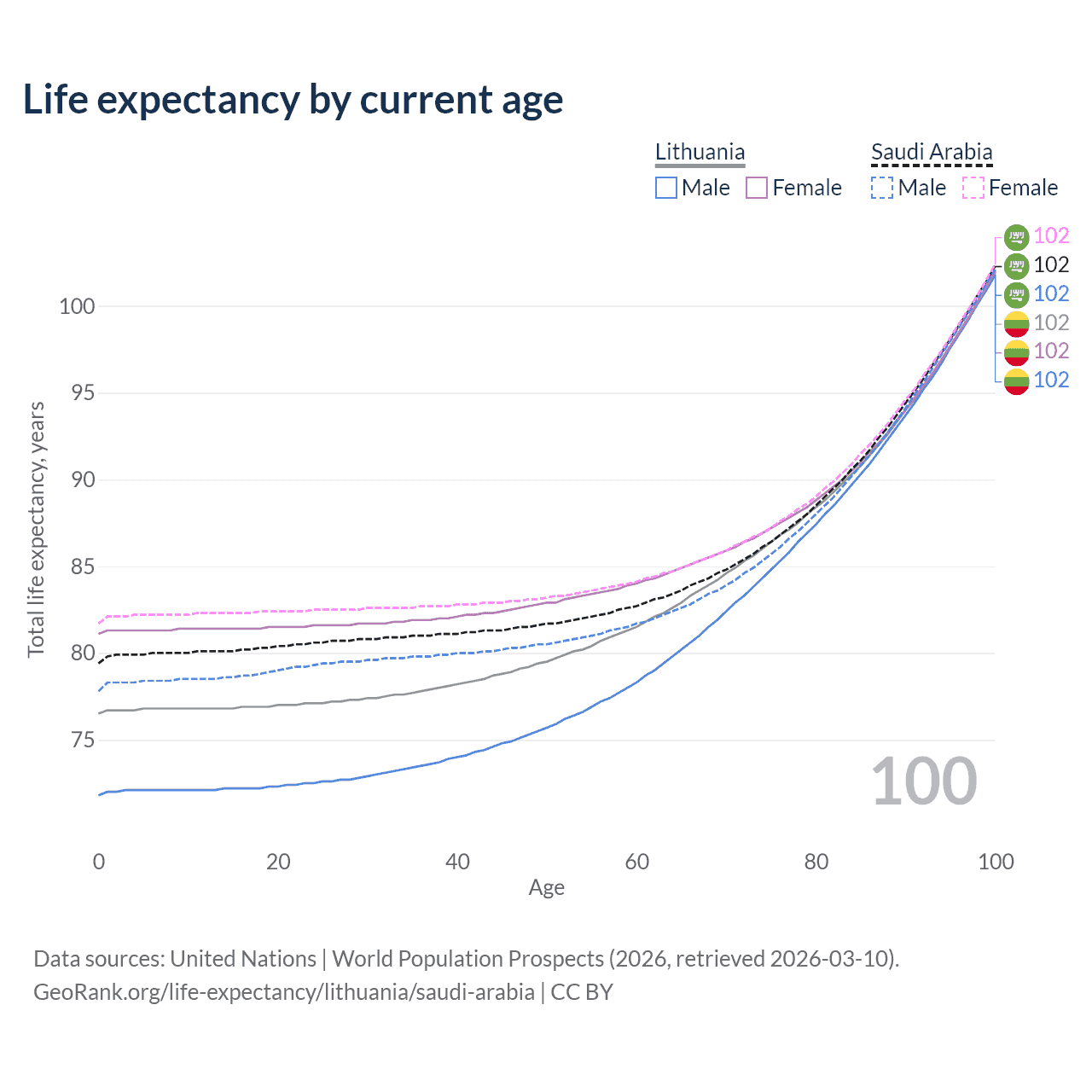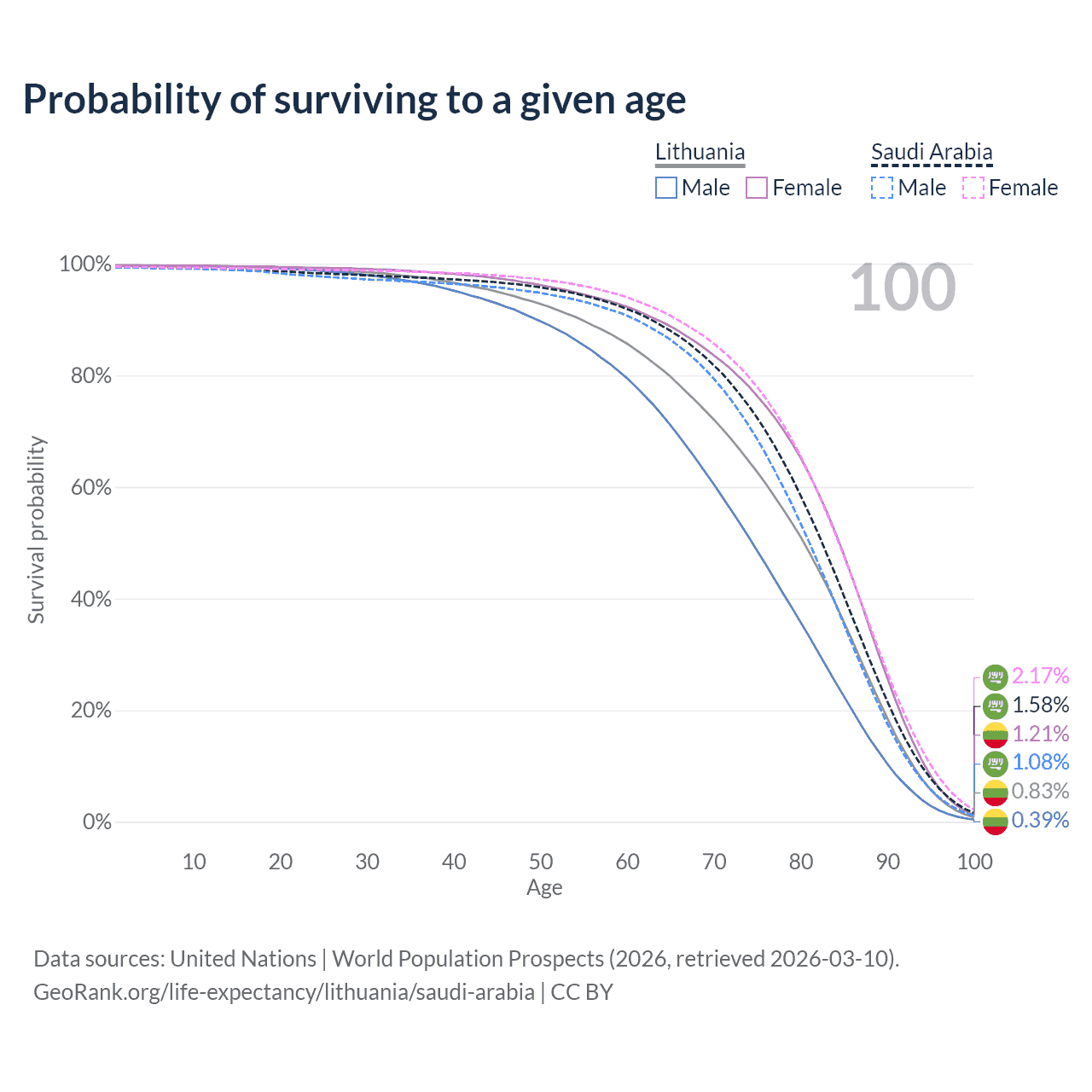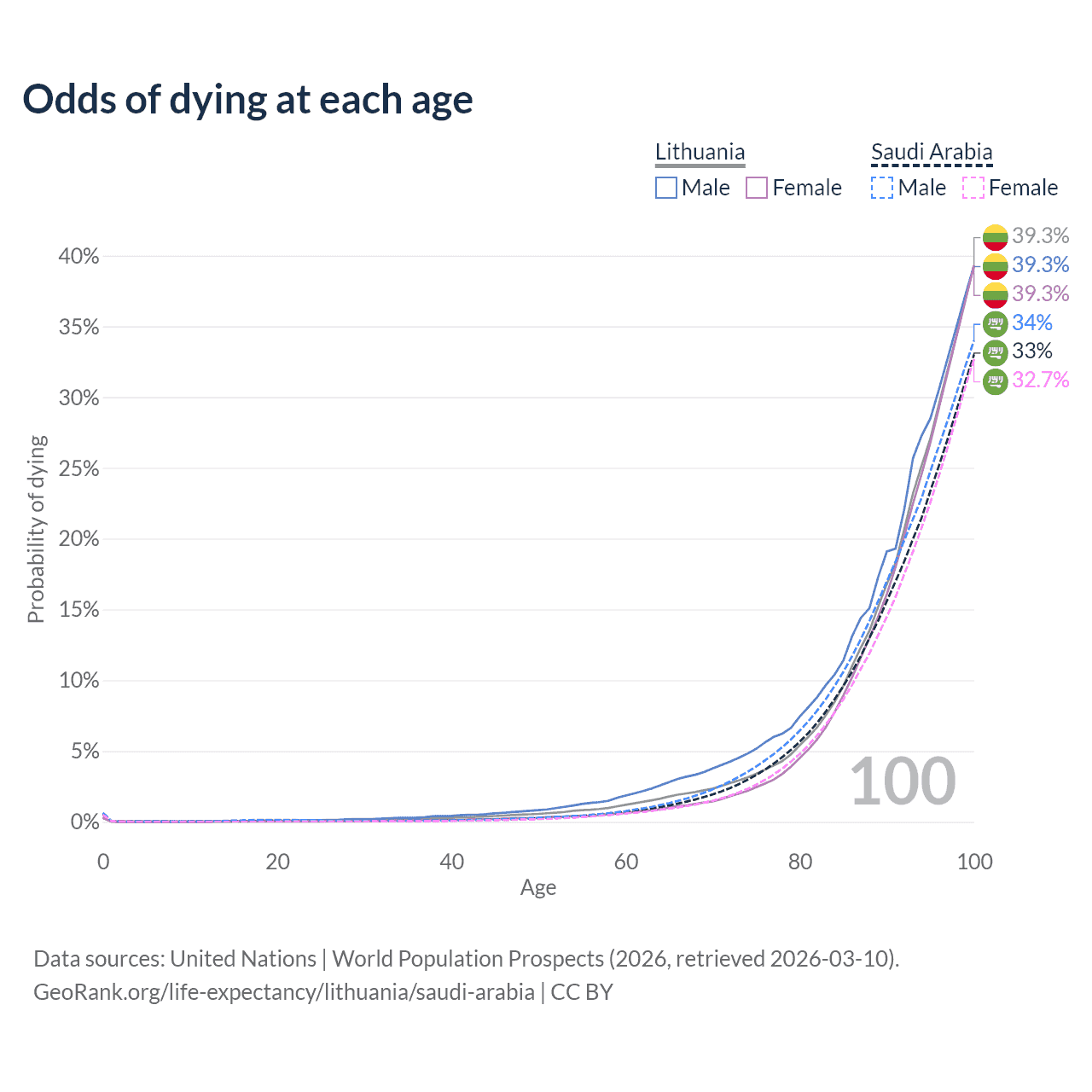 This life expectancy calculator shows the odds of living to 100, 95, 90, and below based on current age for both males and females in Lithuania and Saudi Arabia, along with mean and median age of death. The calculations are based on the 2026 life tables (actuarial tables) from the UN World Population Prospects.