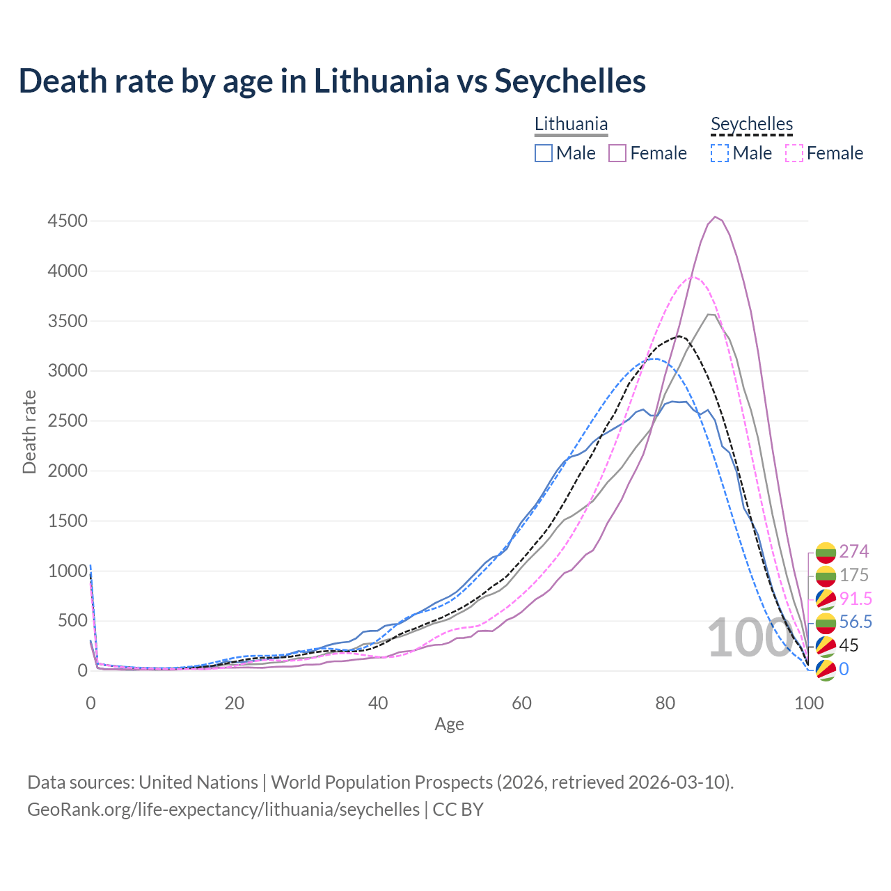 In Lithuania, the most common age of death is 86, compared to 82 in the Seychelles. The median age of death is 80.4 in Lithuania and 77 in the Seychelles, meaning only half of each cohort is expected to live past that age.
