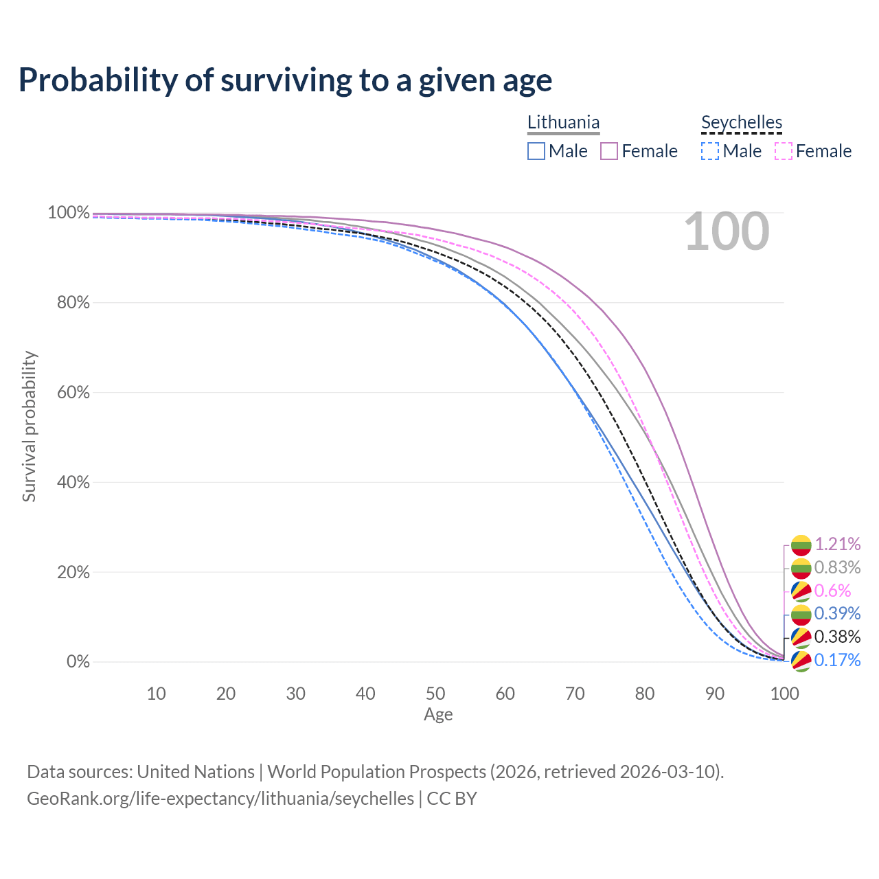 This life expectancy calculator shows the odds of living to 100, 95, 90, and below based on current age for both males and females in Lithuania and the Seychelles, along with mean and median age of death. The calculations are based on the 2026 life tables (actuarial tables) from the UN World Population Prospects.