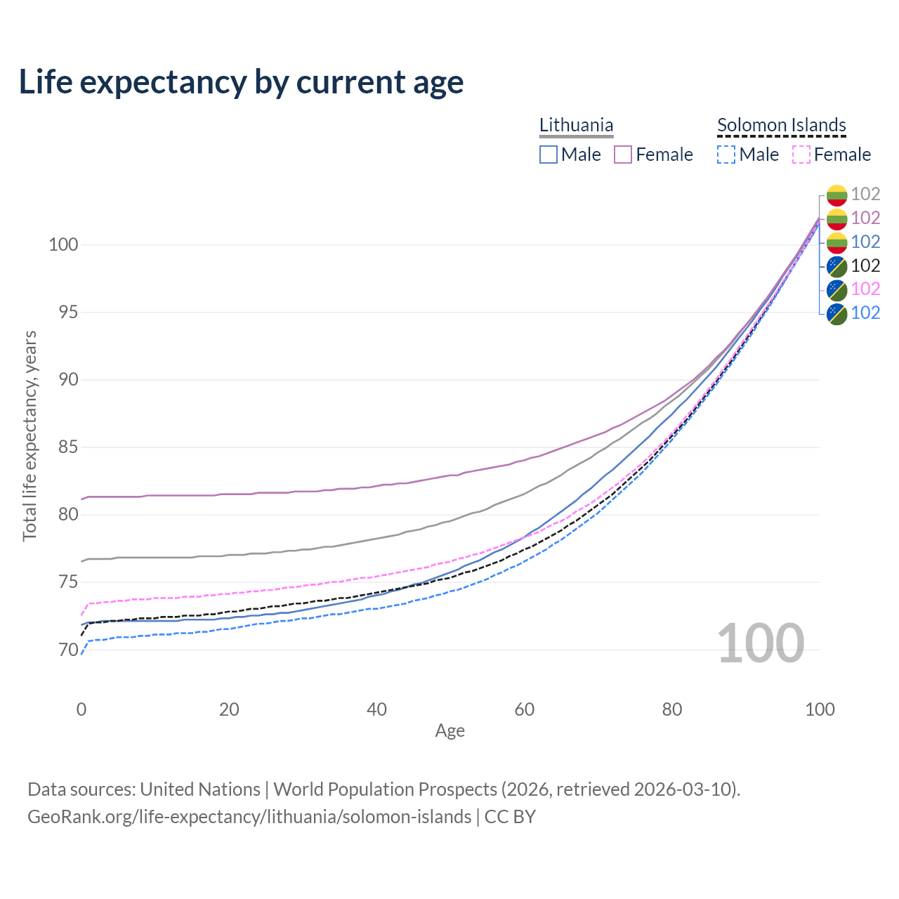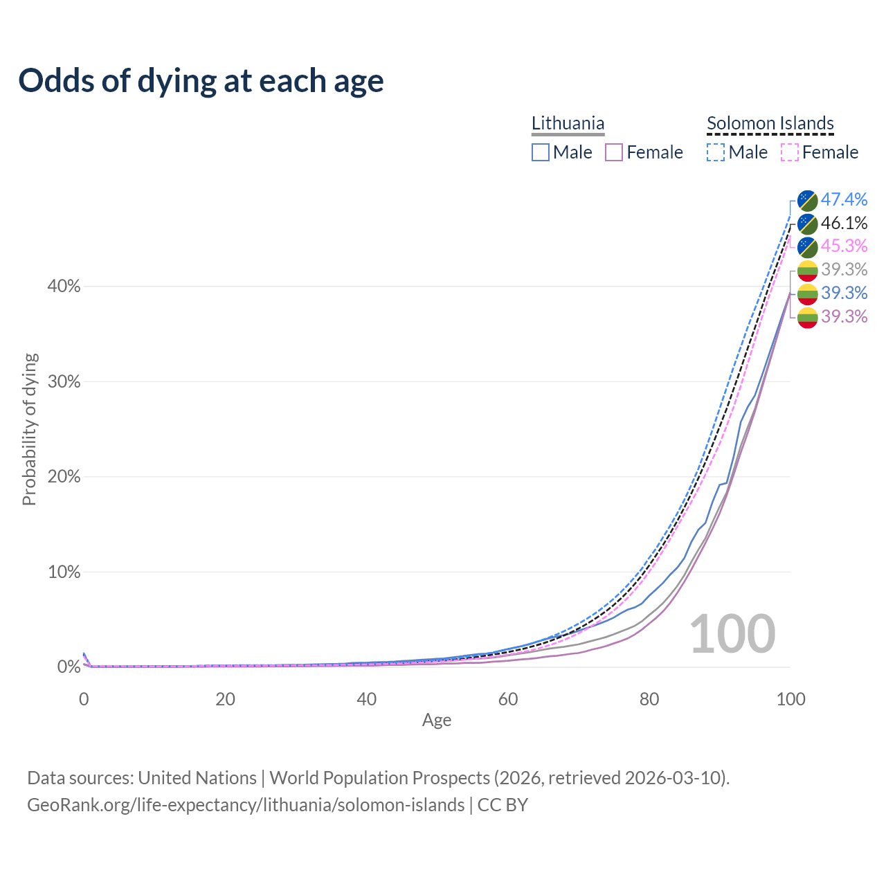 This life expectancy calculator shows the odds of living to 100, 95, 90, and below based on current age for both males and females in Lithuania and the Solomon Islands, along with mean and median age of death. The calculations are based on the 2026 life tables (actuarial tables) from the UN World Population Prospects.