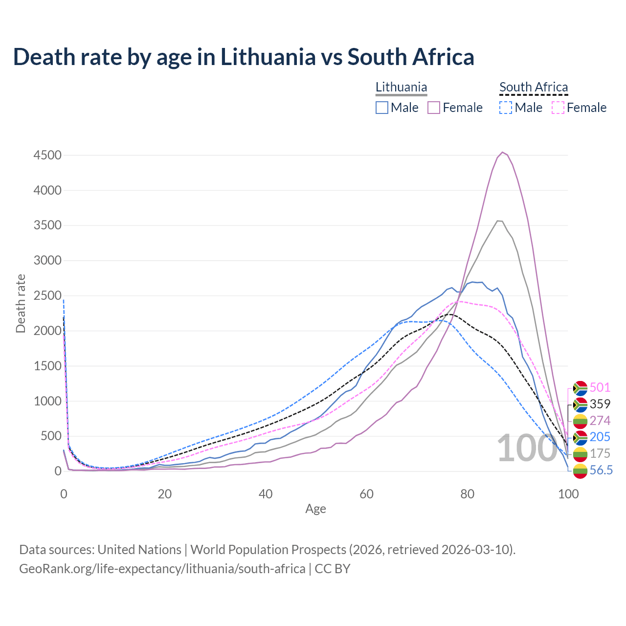 In Lithuania, the most common age of death is 86, compared to 77 in South Africa. The median age of death is 80.4 in Lithuania and 70.8 in South Africa, meaning only half of each cohort is expected to live past that age.