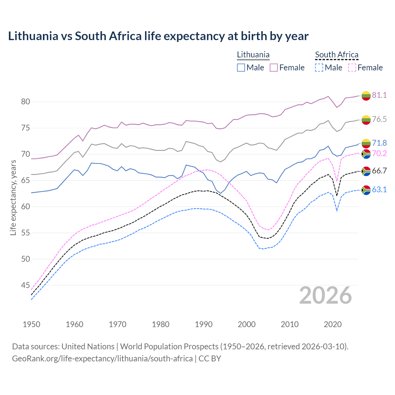 The average life expectancy at birth is 76.5 years in Lithuania vs 66.7 in South Africa. Lithuania is ranked 80/197 by life expectancy, and South Africa is 164/197. In Lithuania, the life expectancy is 71.8 years for males and 81.1 years for females. In South Africa, it's 63.1 years for males and 70.2 years for females.