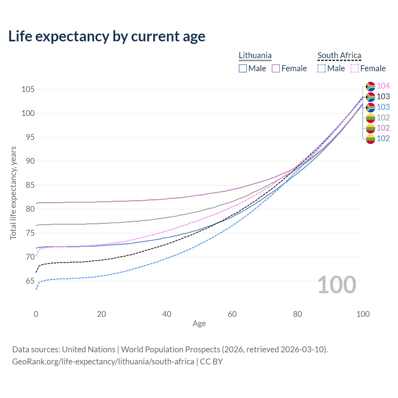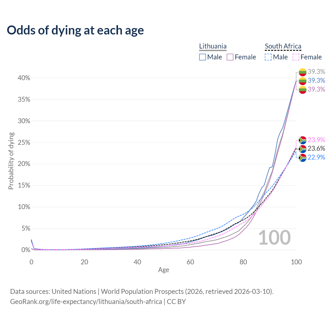 This life expectancy calculator shows the odds of living to 100, 95, 90, and below based on current age for both males and females in Lithuania and South Africa, along with mean and median age of death. The calculations are based on the 2026 life tables (actuarial tables) from the UN World Population Prospects.