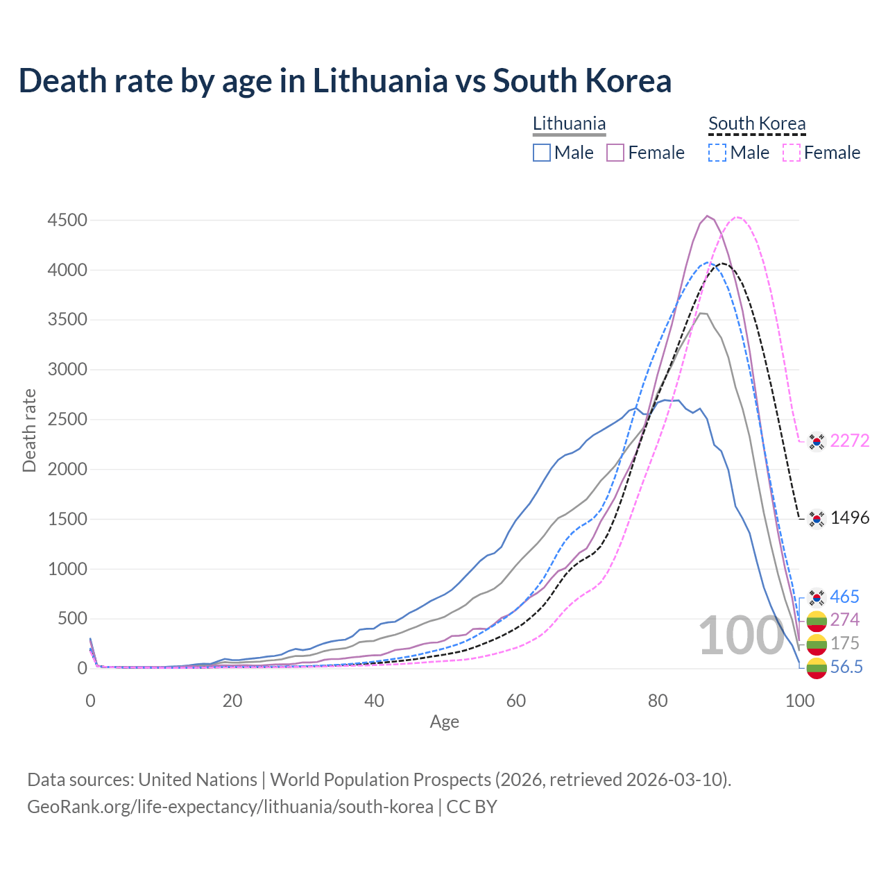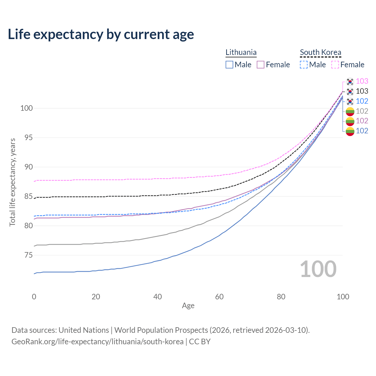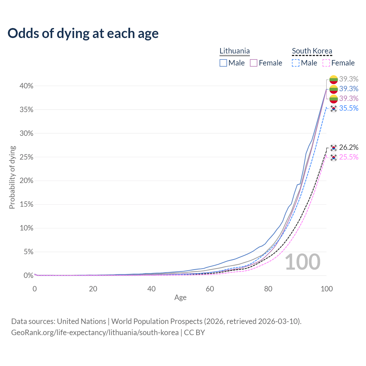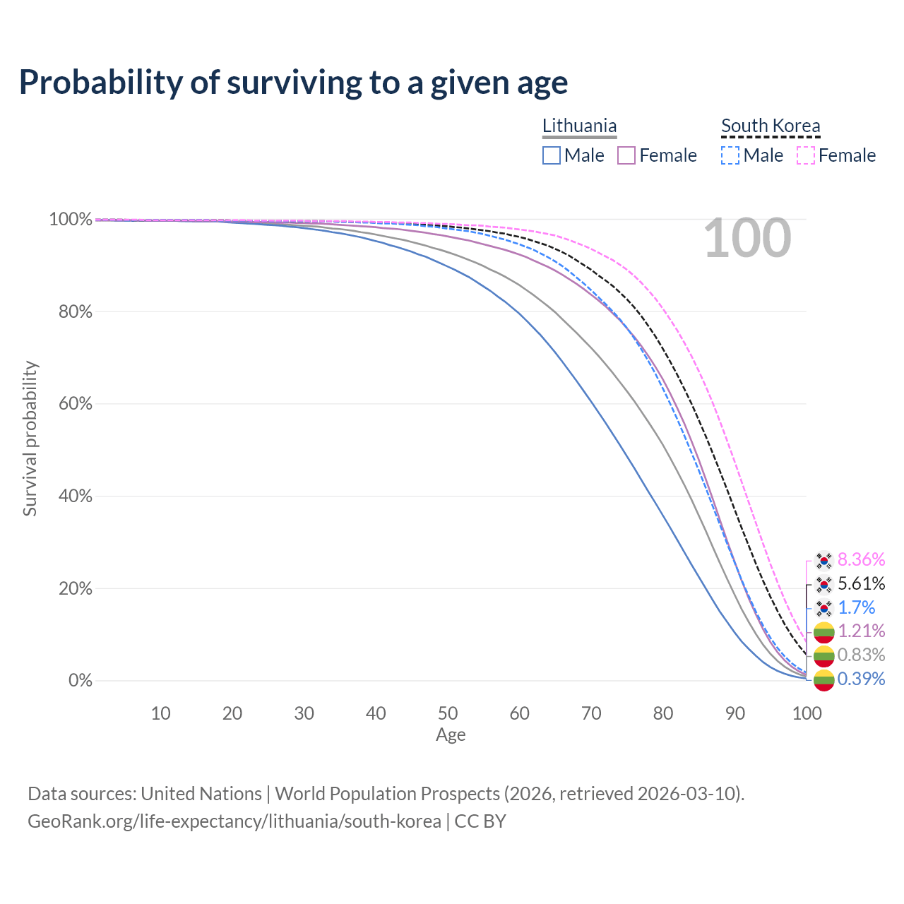 This life expectancy calculator shows the odds of living to 100, 95, 90, and below based on current age for both males and females in Lithuania and South Korea, along with mean and median age of death. The calculations are based on the 2026 life tables (actuarial tables) from the UN World Population Prospects.