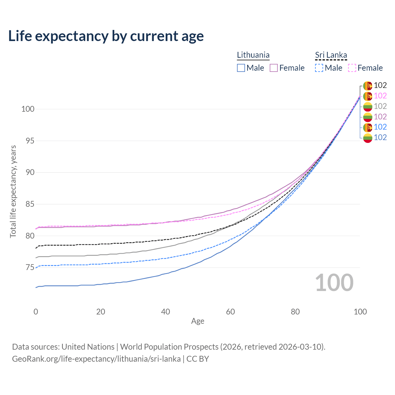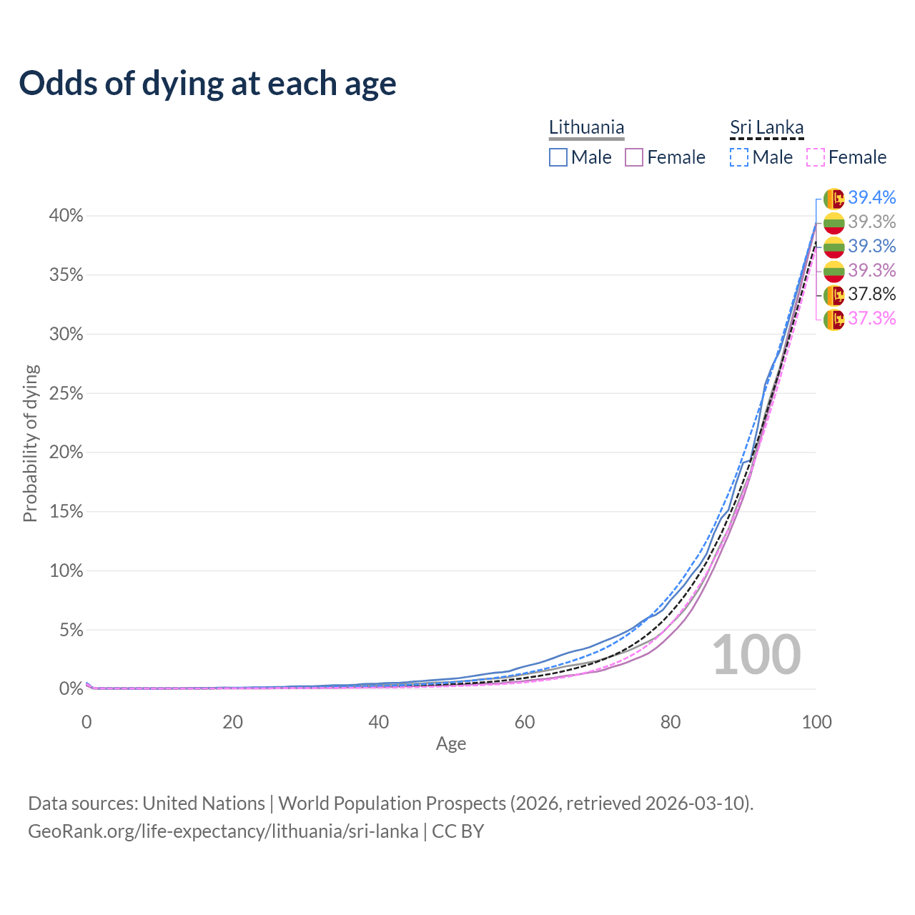 This life expectancy calculator shows the odds of living to 100, 95, 90, and below based on current age for both males and females in Lithuania and Sri Lanka, along with mean and median age of death. The calculations are based on the 2026 life tables (actuarial tables) from the UN World Population Prospects.