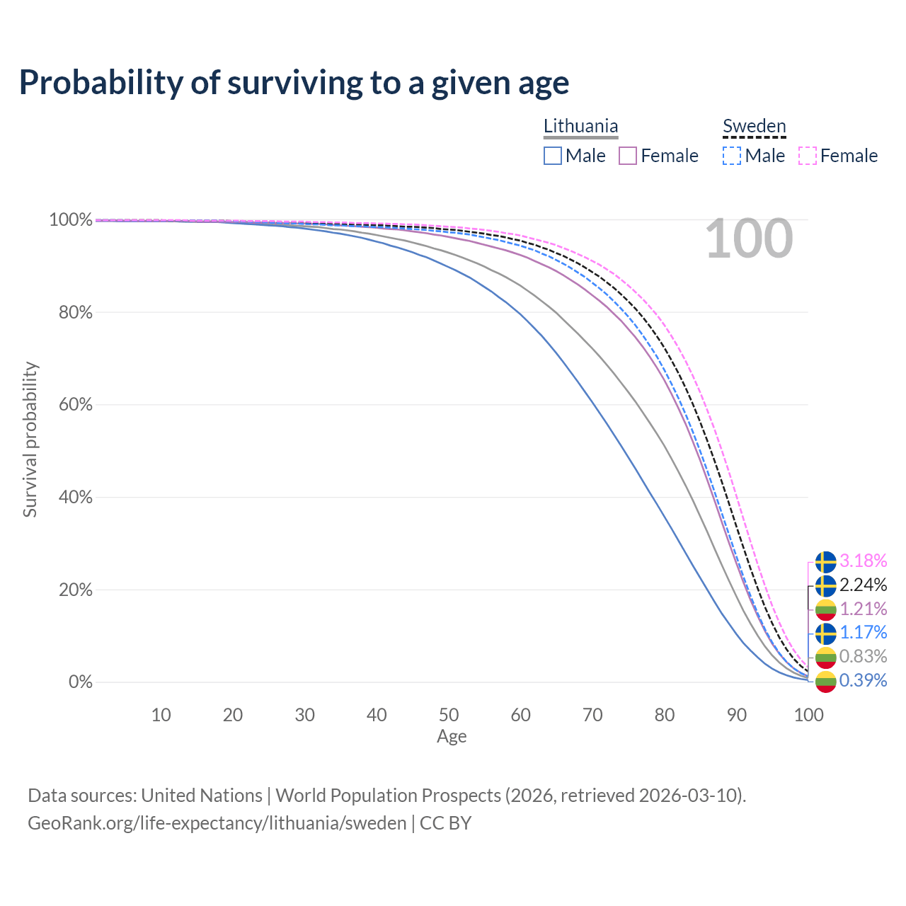 This life expectancy calculator shows the odds of living to 100, 95, 90, and below based on current age for both males and females in Lithuania and Sweden, along with mean and median age of death. The calculations are based on the 2026 life tables (actuarial tables) from the UN World Population Prospects.