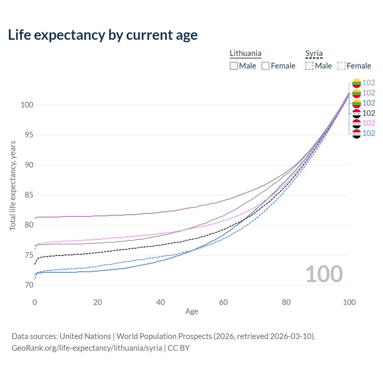 This life expectancy calculator shows the odds of living to 100, 95, 90, and below based on current age for both males and females in Lithuania and Syria, along with mean and median age of death. The calculations are based on the 2026 life tables (actuarial tables) from the UN World Population Prospects.