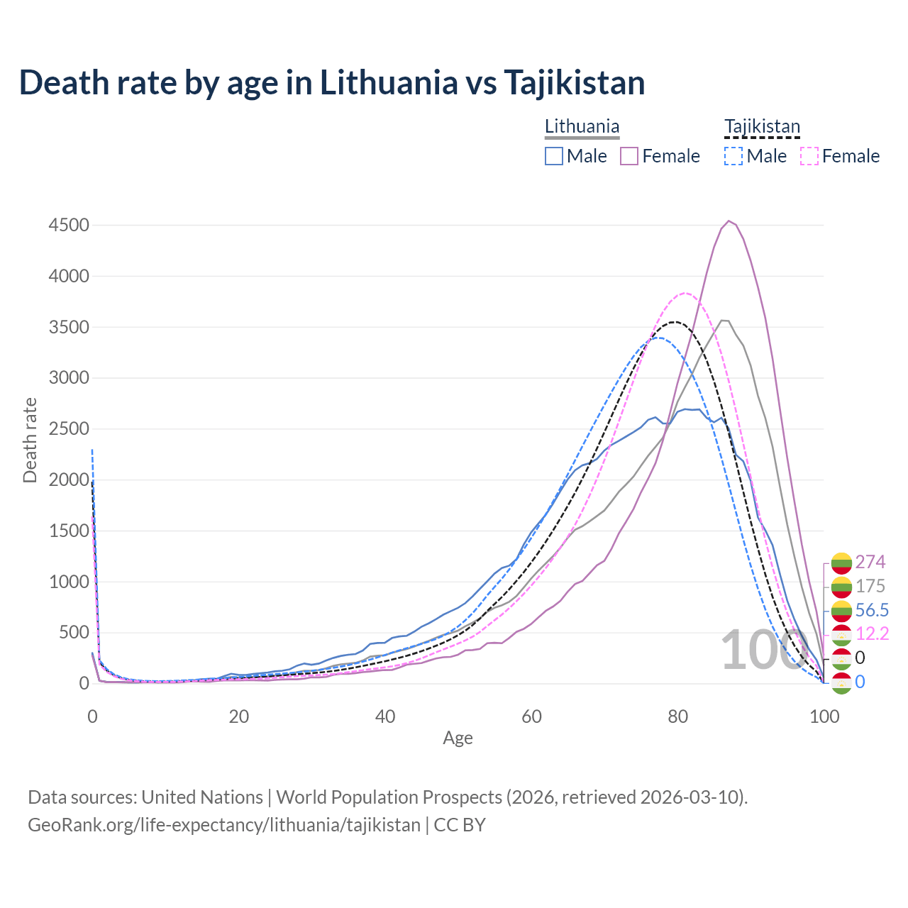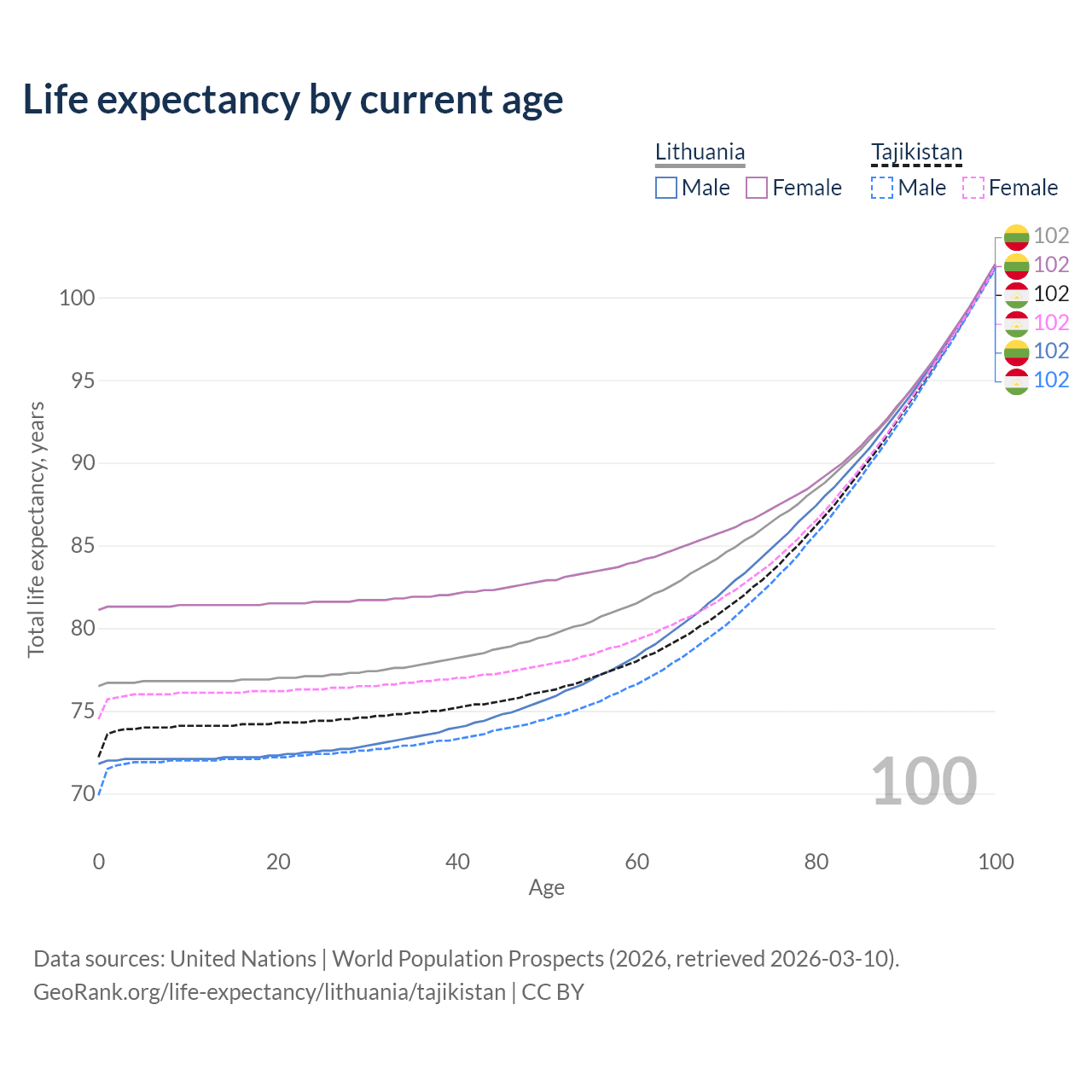 This life expectancy calculator shows the odds of living to 100, 95, 90, and below based on current age for both males and females in Lithuania and Tajikistan, along with mean and median age of death. The calculations are based on the 2026 life tables (actuarial tables) from the UN World Population Prospects.