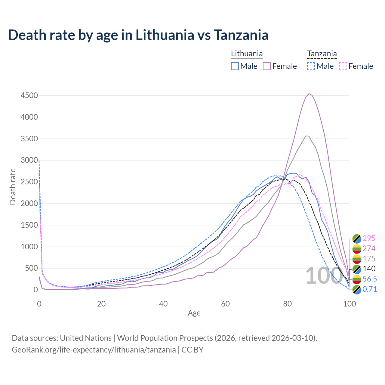 In Lithuania, the most common age of death is 86, compared to 0 in Tanzania. The median age of death is 80.4 in Lithuania and 72.6 in Tanzania, meaning only half of each cohort is expected to live past that age.