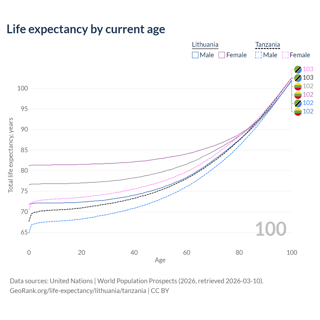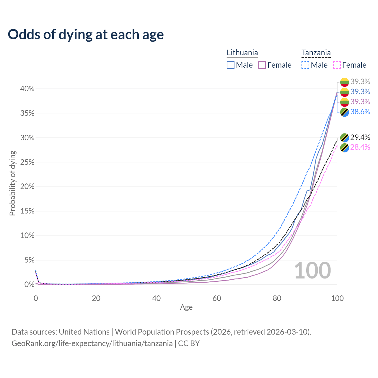 This life expectancy calculator shows the odds of living to 100, 95, 90, and below based on current age for both males and females in Lithuania and Tanzania, along with mean and median age of death. The calculations are based on the 2026 life tables (actuarial tables) from the UN World Population Prospects.