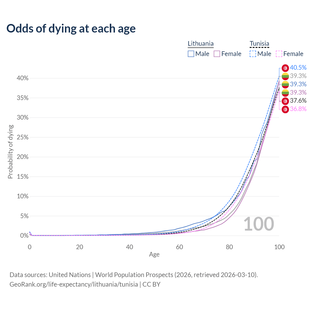 This life expectancy calculator shows the odds of living to 100, 95, 90, and below based on current age for both males and females in Lithuania and Tunisia, along with mean and median age of death. The calculations are based on the 2026 life tables (actuarial tables) from the UN World Population Prospects.