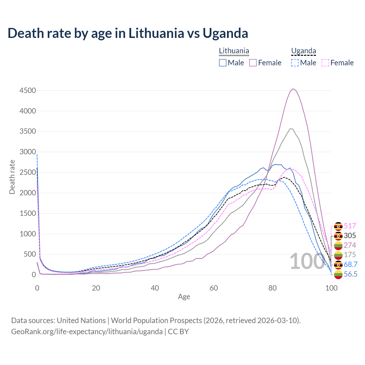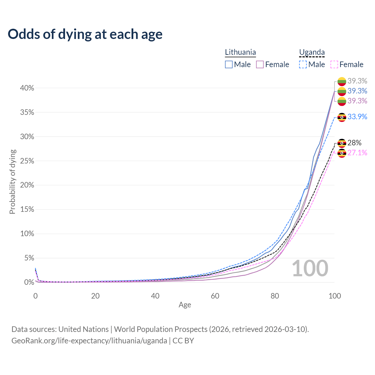 This life expectancy calculator shows the odds of living to 100, 95, 90, and below based on current age for both males and females in Lithuania and Uganda, along with mean and median age of death. The calculations are based on the 2026 life tables (actuarial tables) from the UN World Population Prospects.