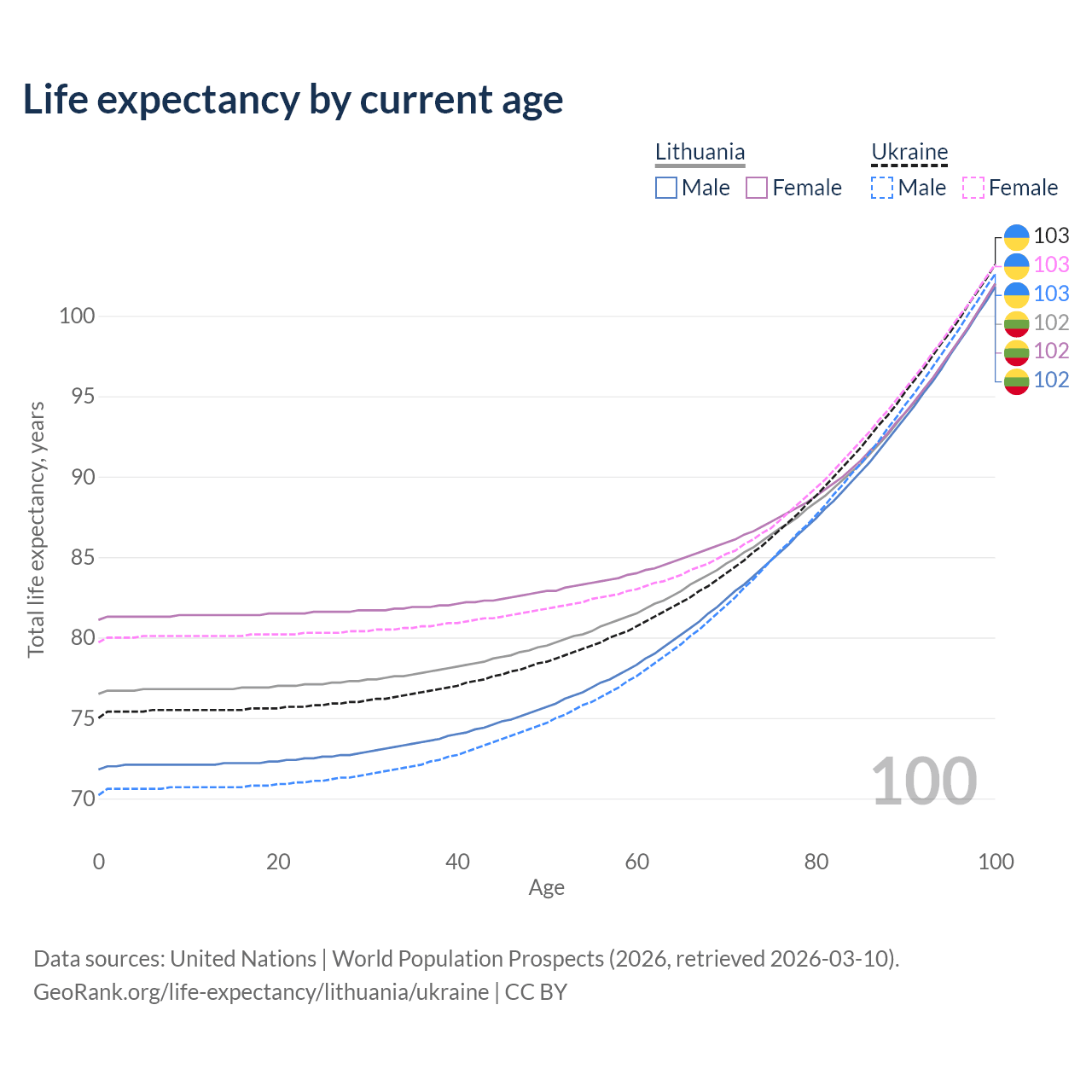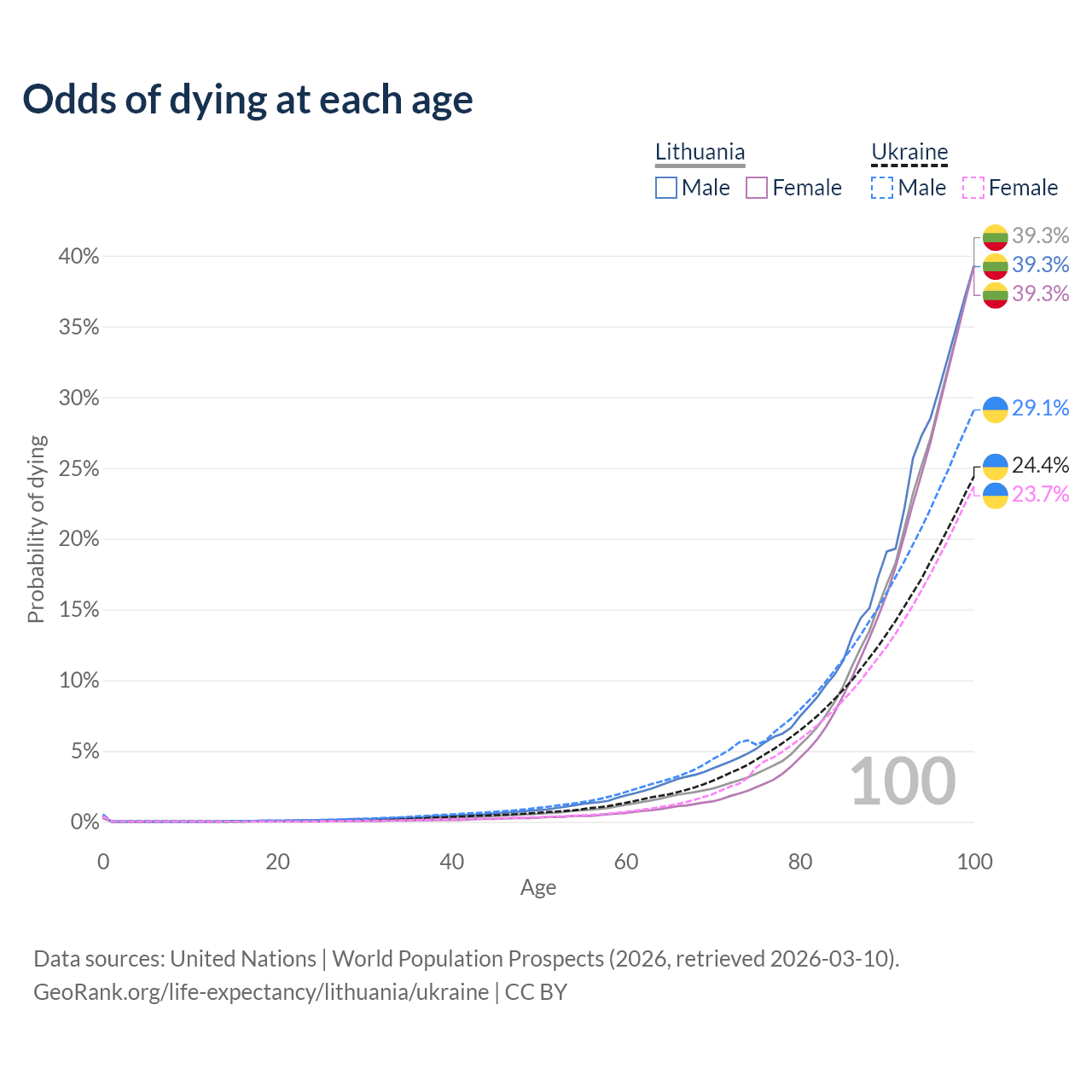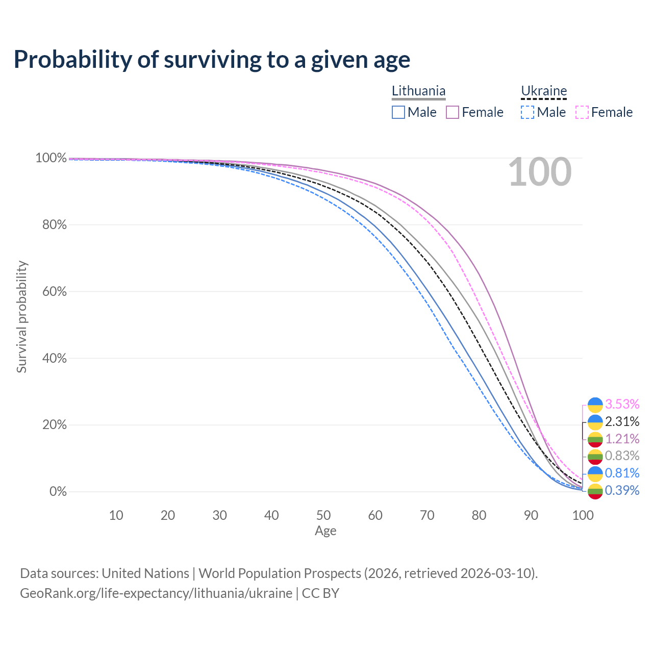 This life expectancy calculator shows the odds of living to 100, 95, 90, and below based on current age for both males and females in Lithuania and Ukraine, along with mean and median age of death. The calculations are based on the 2026 life tables (actuarial tables) from the UN World Population Prospects.