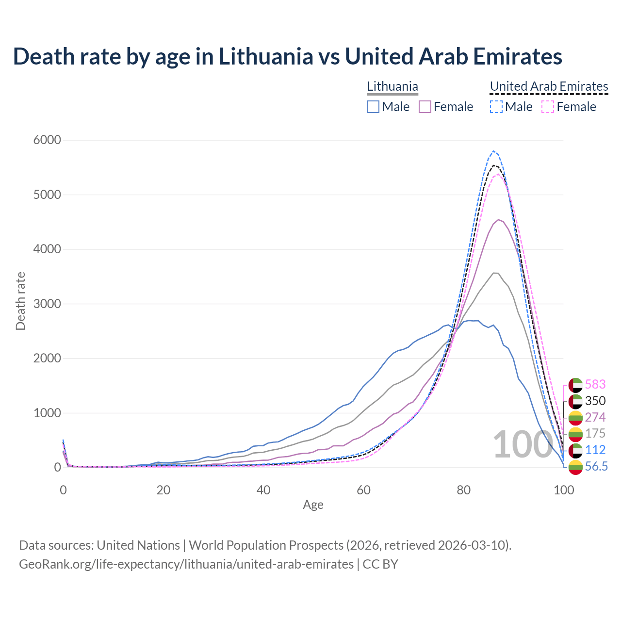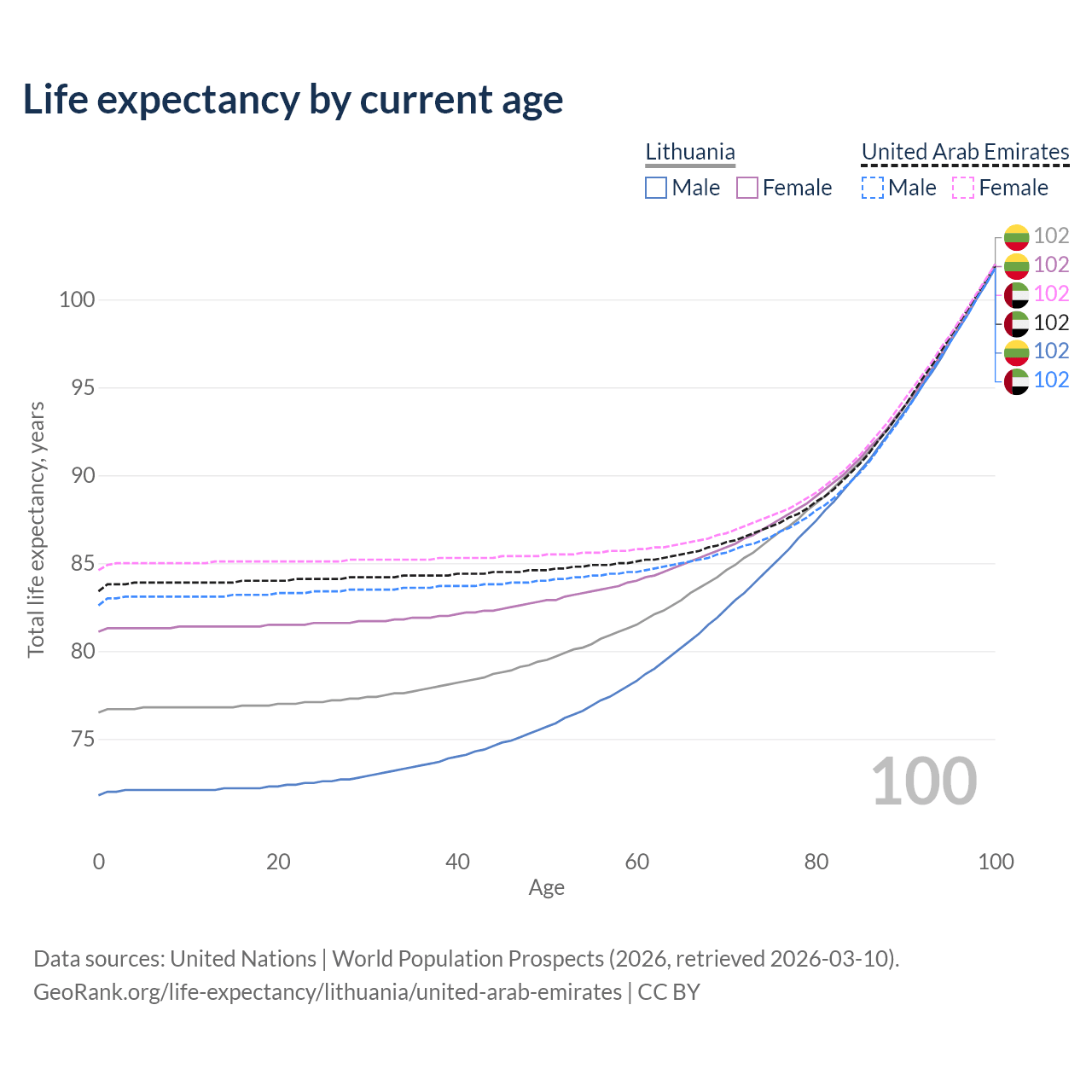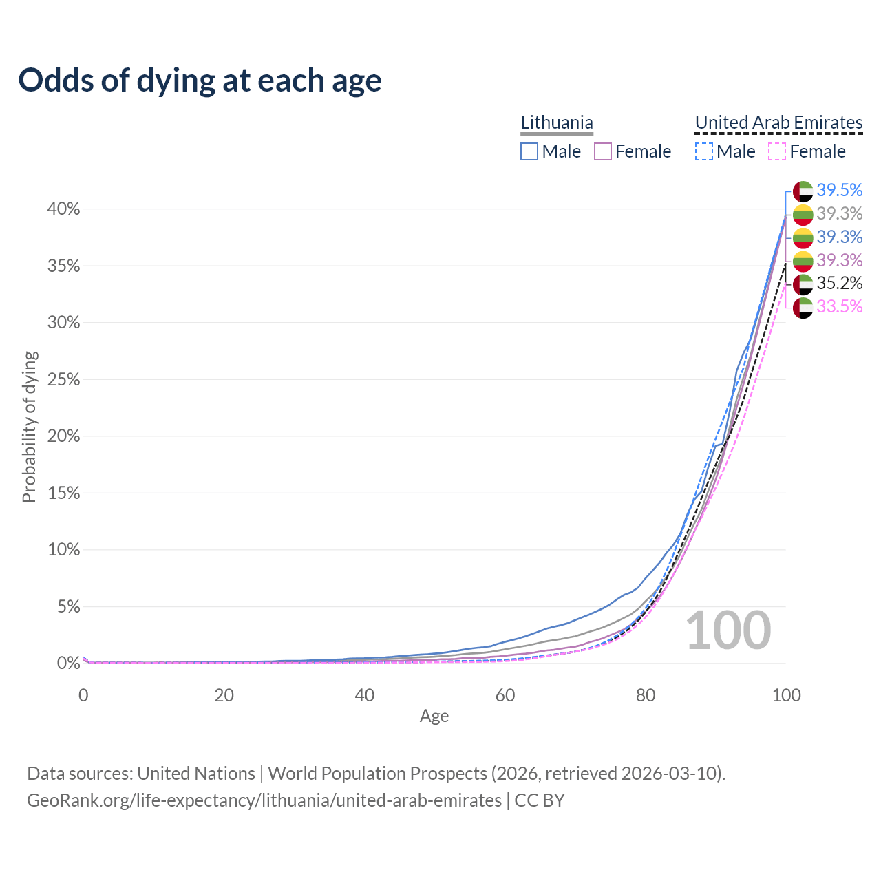 This life expectancy calculator shows the odds of living to 100, 95, 90, and below based on current age for both males and females in Lithuania and the United Arab Emirates, along with mean and median age of death. The calculations are based on the 2026 life tables (actuarial tables) from the UN World Population Prospects.