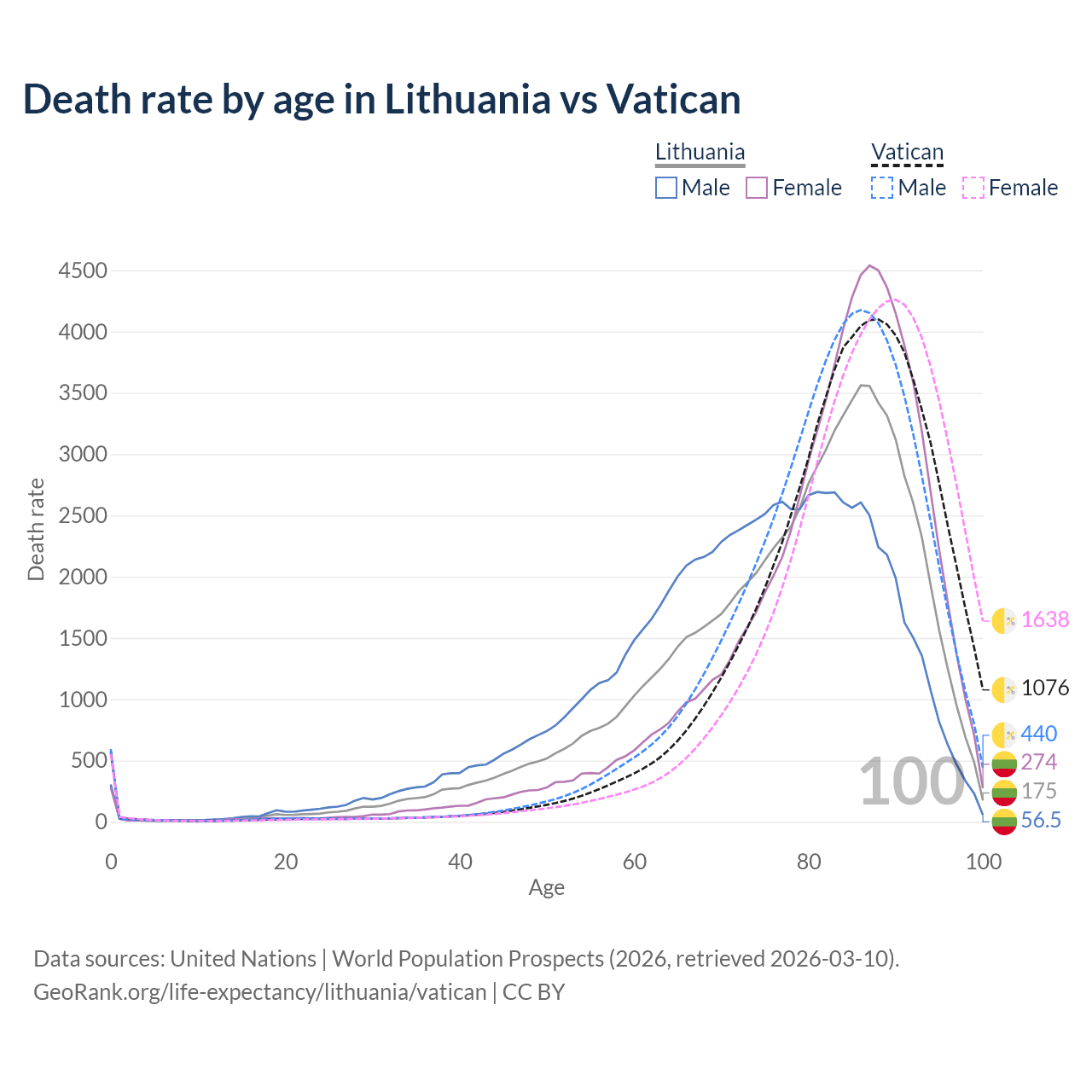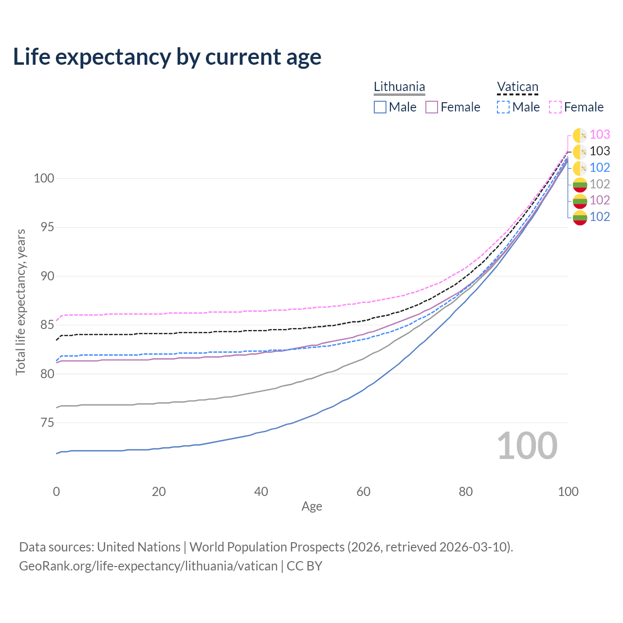 This life expectancy calculator shows the odds of living to 100, 95, 90, and below based on current age for both males and females in Lithuania and the Vatican, along with mean and median age of death. The calculations are based on the 2026 life tables (actuarial tables) from the UN World Population Prospects.
