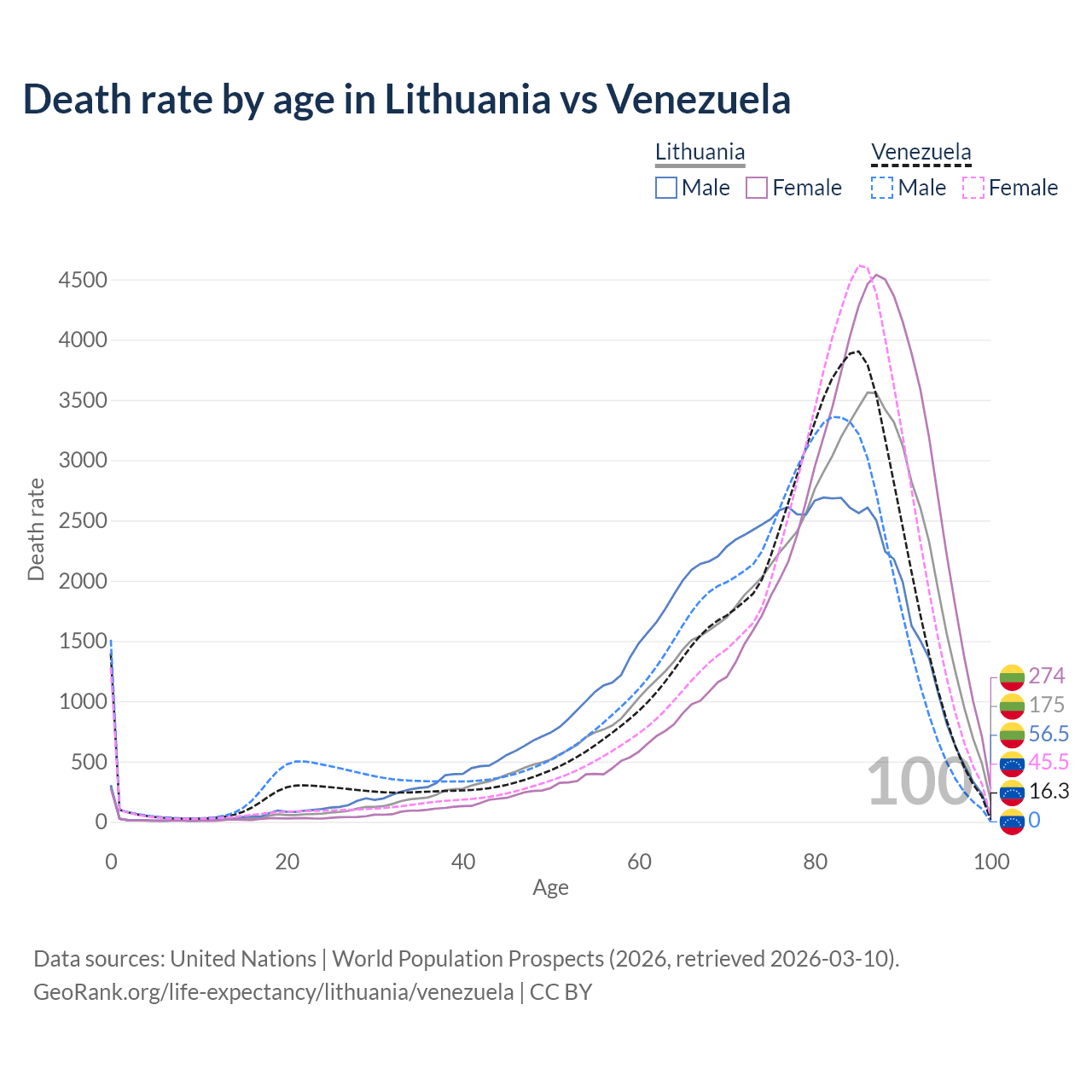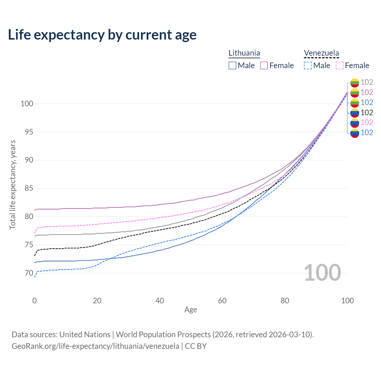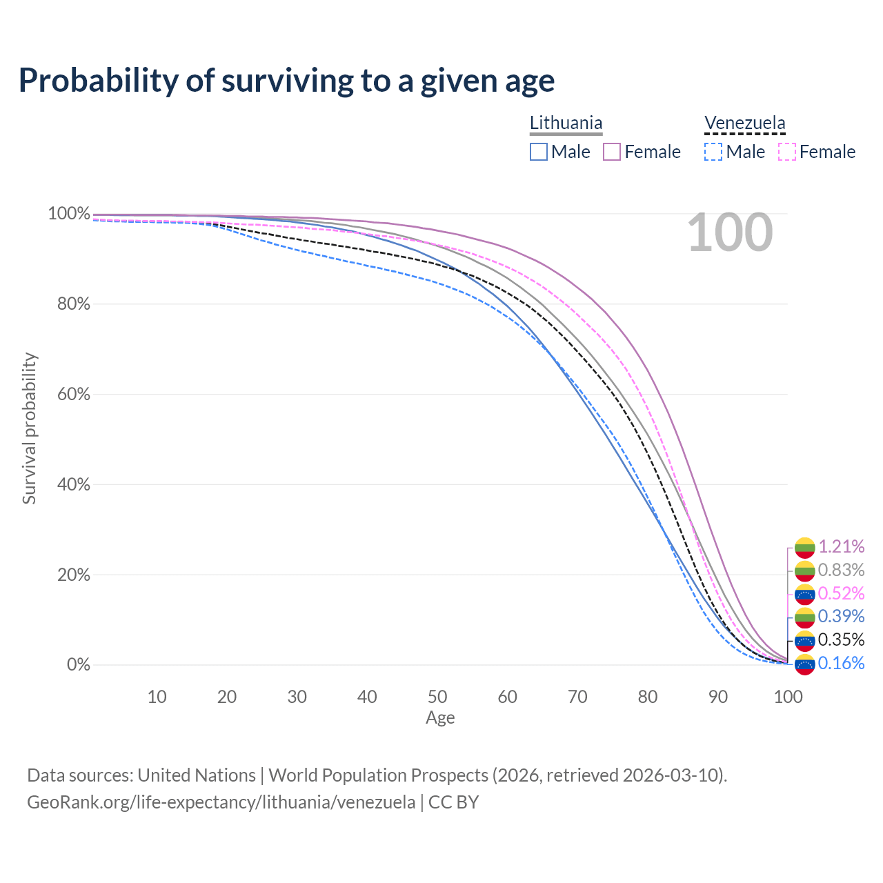 This life expectancy calculator shows the odds of living to 100, 95, 90, and below based on current age for both males and females in Lithuania and Venezuela, along with mean and median age of death. The calculations are based on the 2026 life tables (actuarial tables) from the UN World Population Prospects.