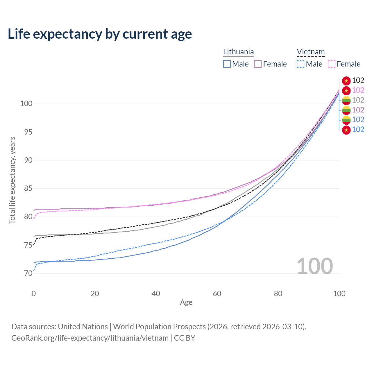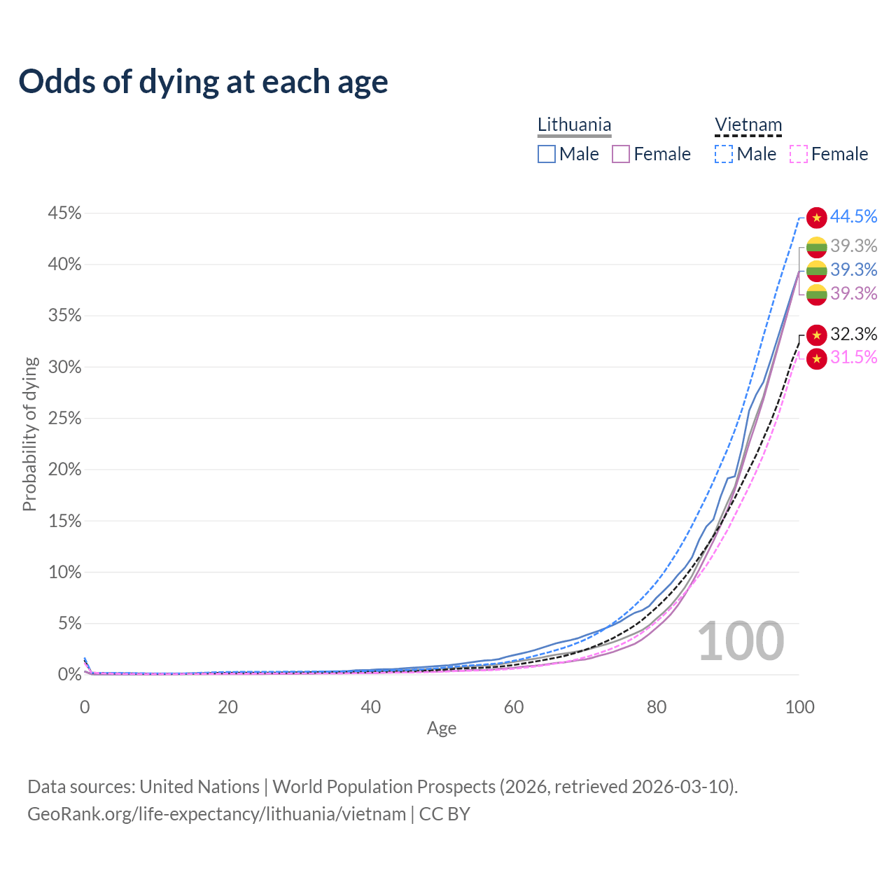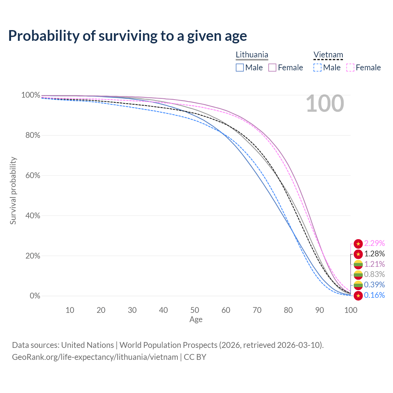 This life expectancy calculator shows the odds of living to 100, 95, 90, and below based on current age for both males and females in Lithuania and Vietnam, along with mean and median age of death. The calculations are based on the 2026 life tables (actuarial tables) from the UN World Population Prospects.