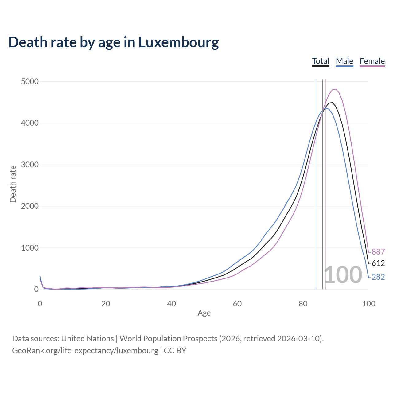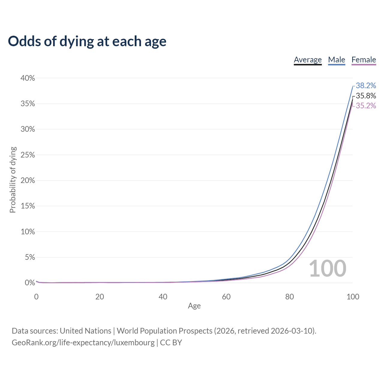 This life expectancy calculator shows the odds of living to 100, 95, 90, and below based on current age for both males and females in Luxembourg, along with mean and median age of death. The calculations are based on the 2026 life tables (actuarial tables) from the UN World Population Prospects.