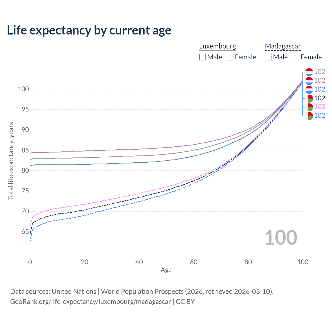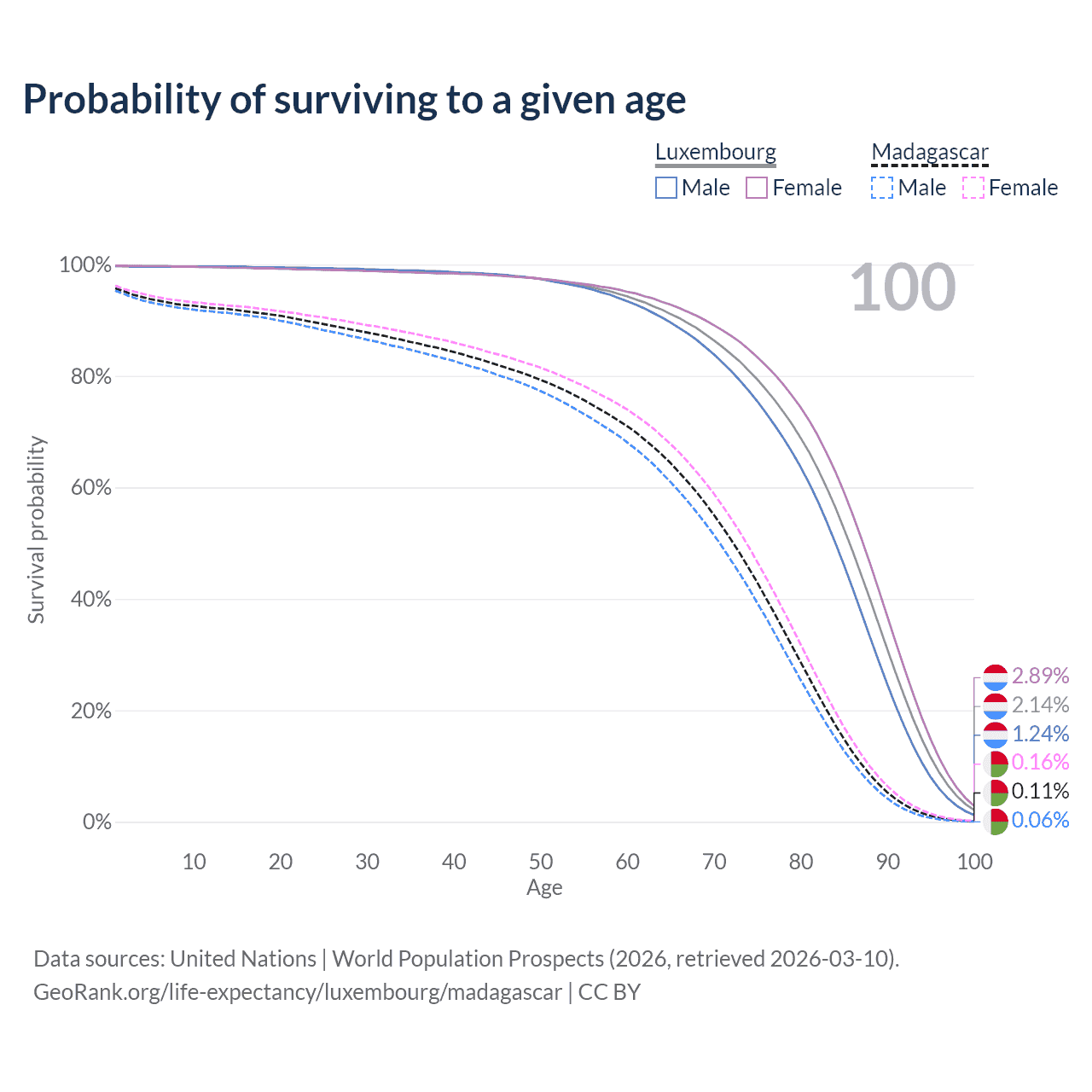 This life expectancy calculator shows the odds of living to 100, 95, 90, and below based on current age for both males and females in Luxembourg and Madagascar, along with mean and median age of death. The calculations are based on the 2026 life tables (actuarial tables) from the UN World Population Prospects.