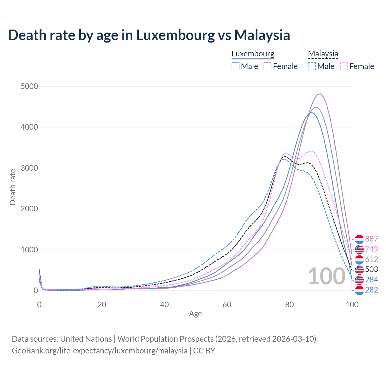 In Luxembourg, the most common age of death is 89, compared to 79 in Malaysia. The median age of death is 85.7 in Luxembourg and 79.8 in Malaysia, meaning only half of each cohort is expected to live past that age.