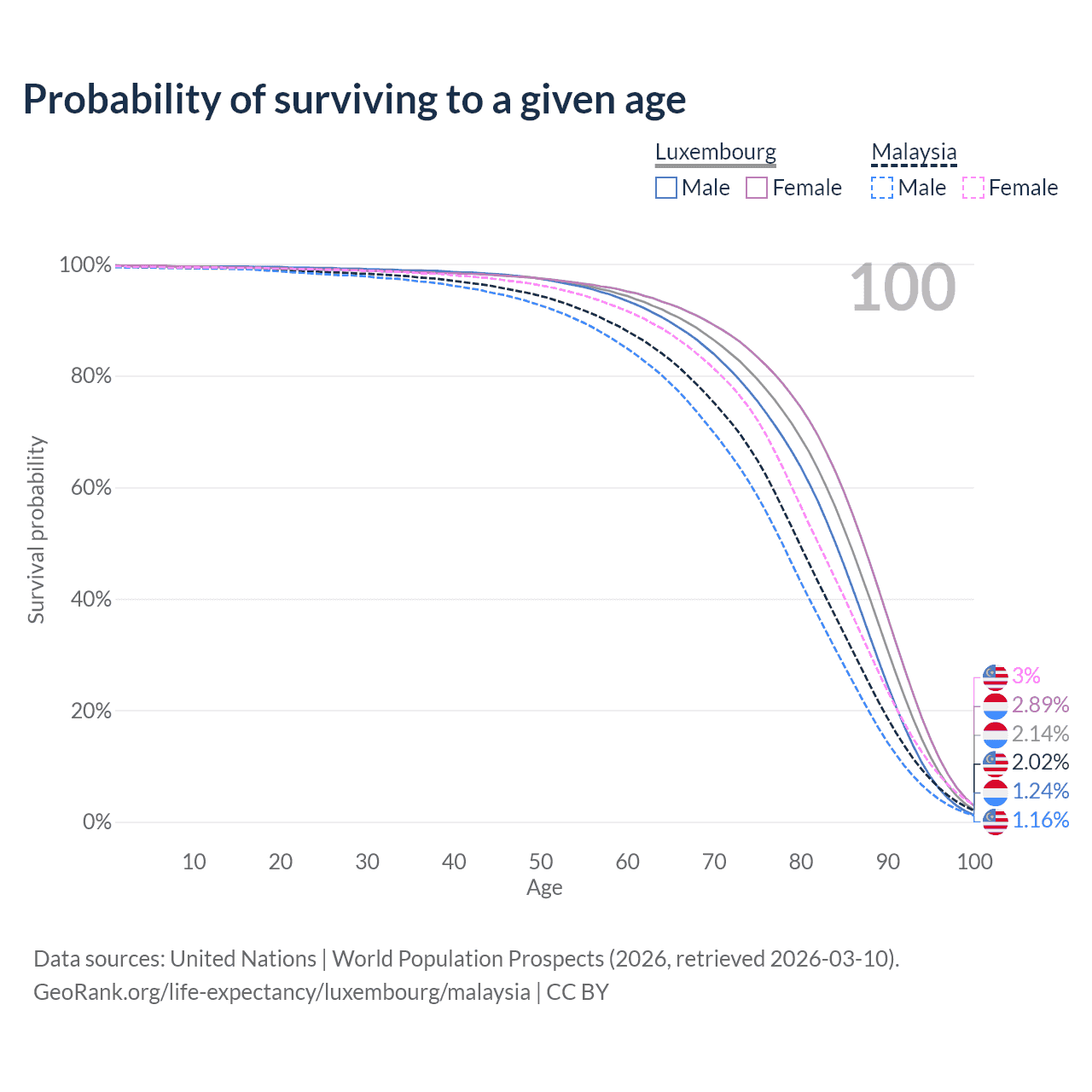 This life expectancy calculator shows the odds of living to 100, 95, 90, and below based on current age for both males and females in Luxembourg and Malaysia, along with mean and median age of death. The calculations are based on the 2026 life tables (actuarial tables) from the UN World Population Prospects.