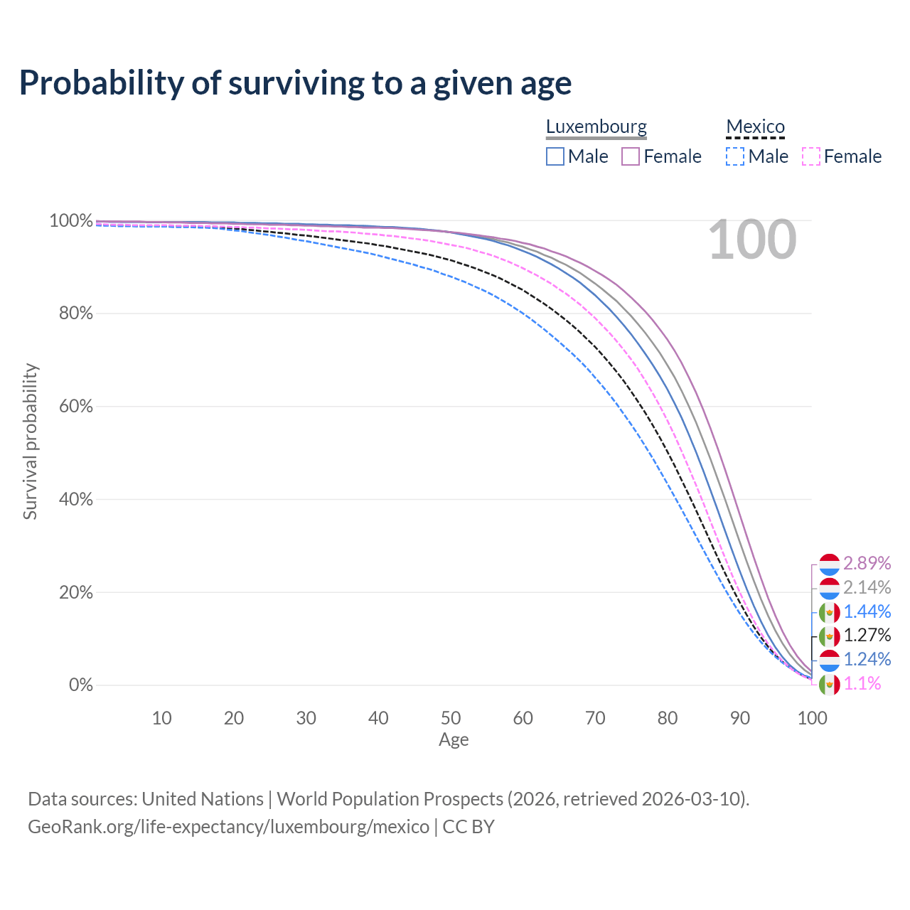 This life expectancy calculator shows the odds of living to 100, 95, 90, and below based on current age for both males and females in Luxembourg and Mexico, along with mean and median age of death. The calculations are based on the 2026 life tables (actuarial tables) from the UN World Population Prospects.