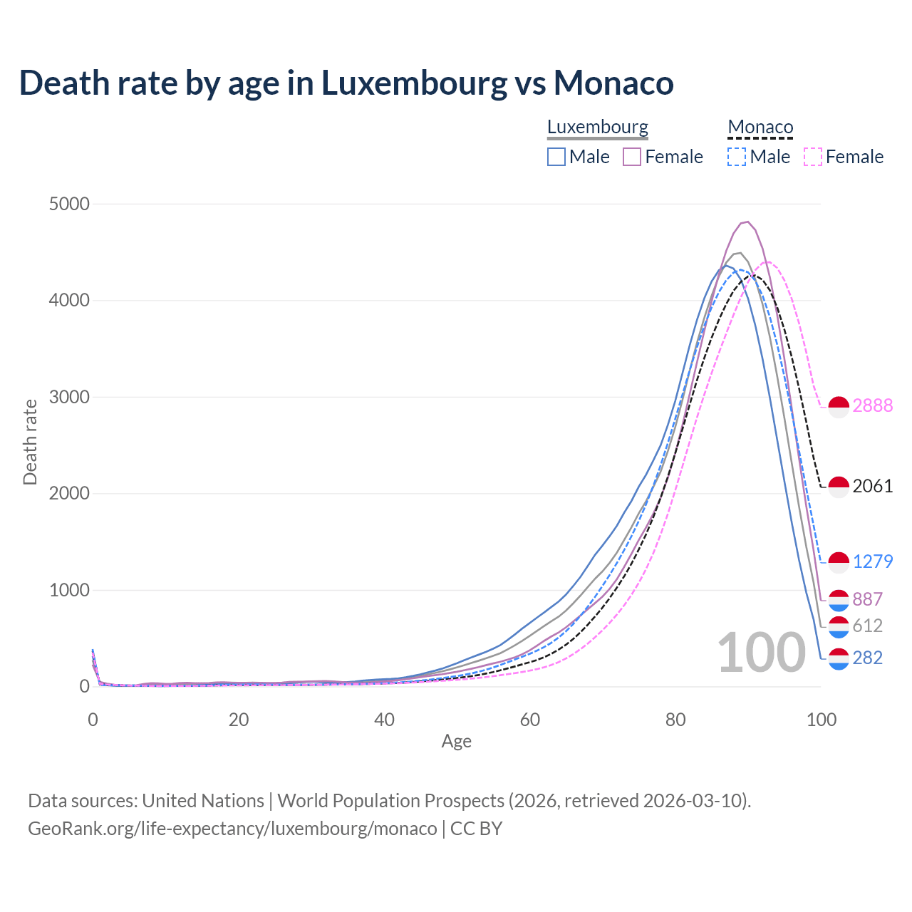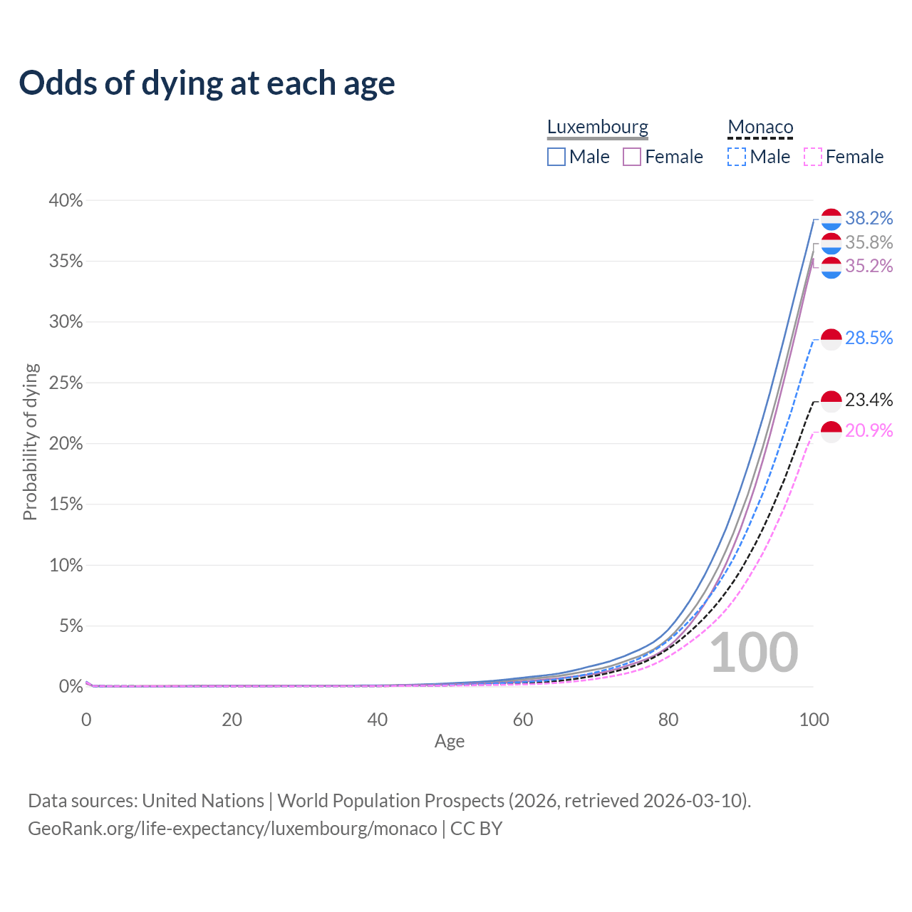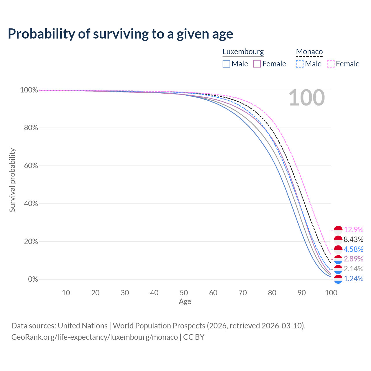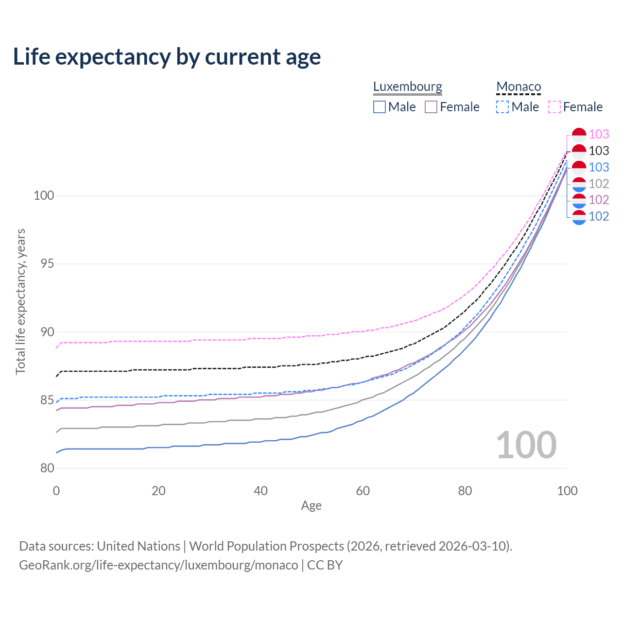 This life expectancy calculator shows the odds of living to 100, 95, 90, and below based on current age for both males and females in Luxembourg and Monaco, along with mean and median age of death. The calculations are based on the 2026 life tables (actuarial tables) from the UN World Population Prospects.