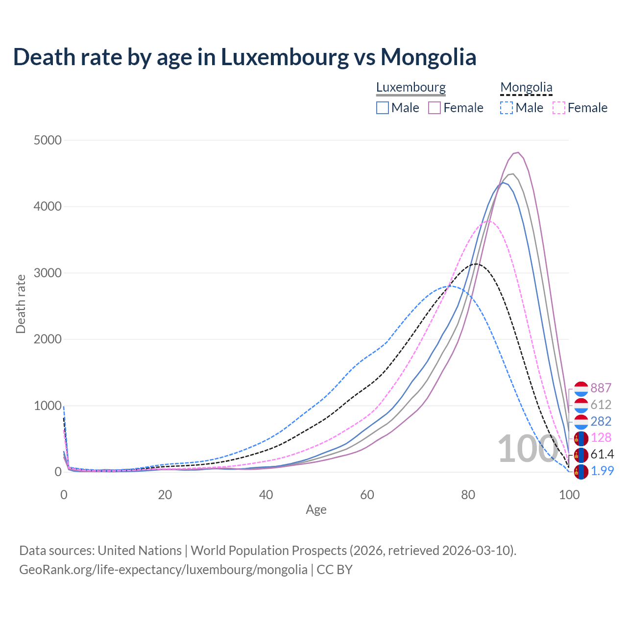 This life expectancy calculator shows the odds of living to 100, 95, 90, and below based on current age for both males and females in Luxembourg and Mongolia, along with mean and median age of death. The calculations are based on the 2026 life tables (actuarial tables) from the UN World Population Prospects.