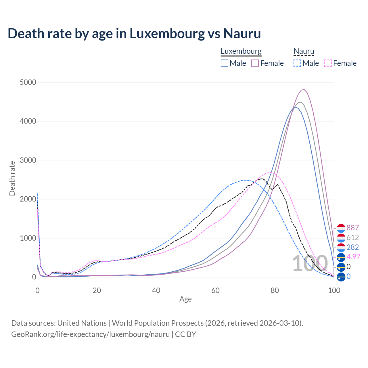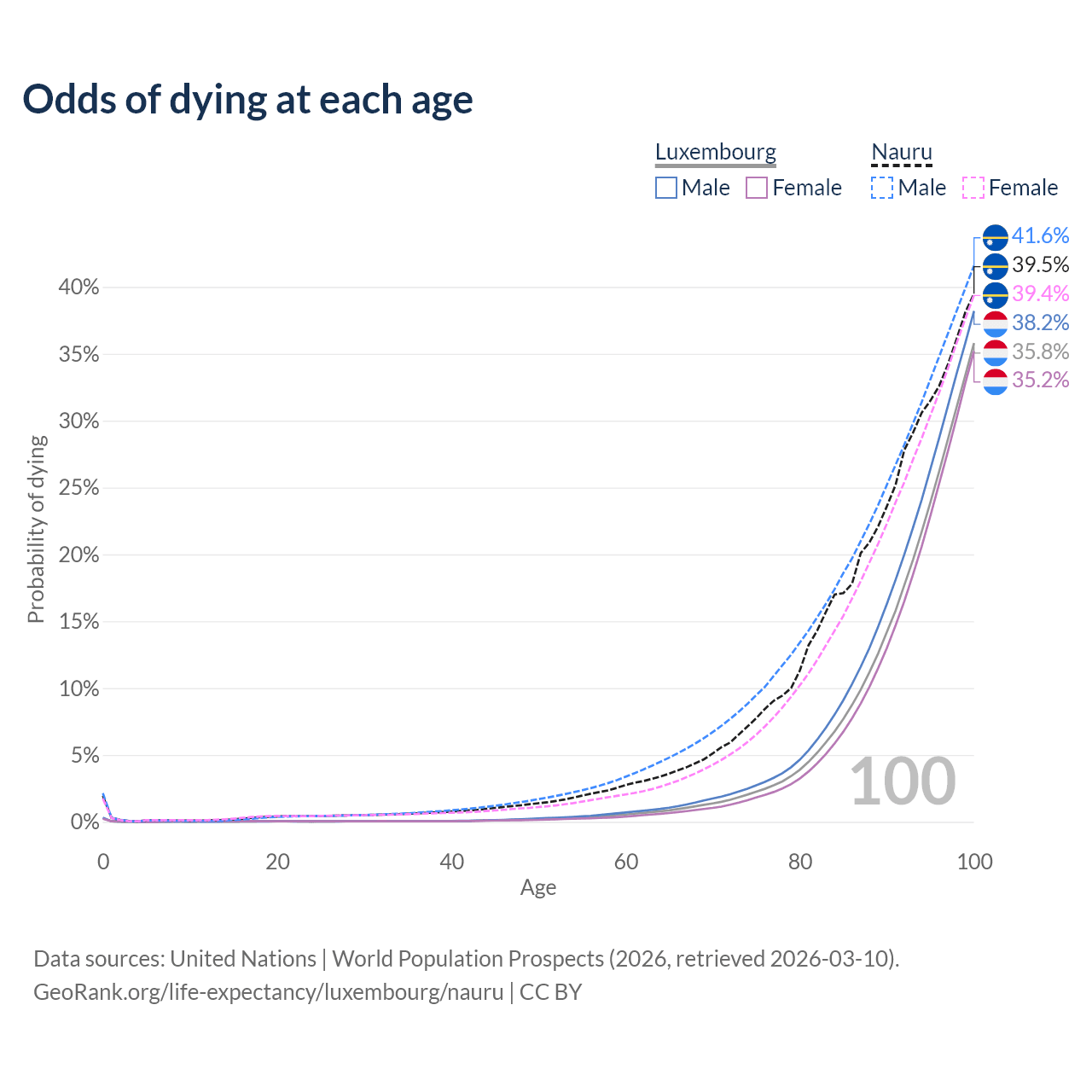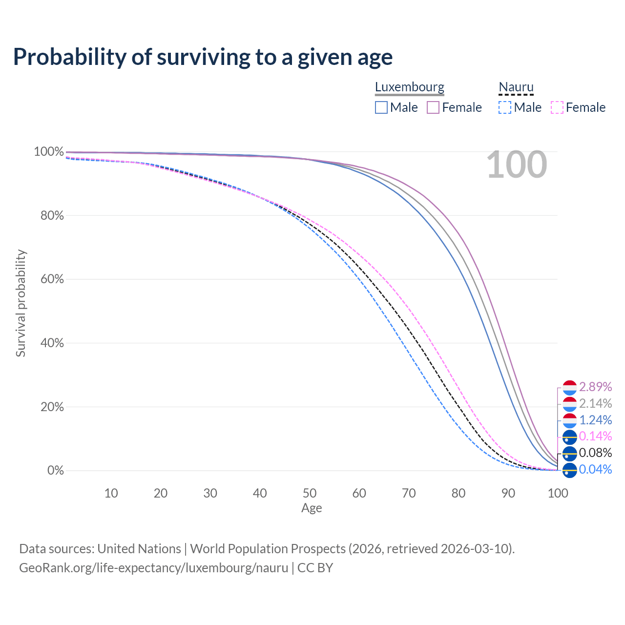 This life expectancy calculator shows the odds of living to 100, 95, 90, and below based on current age for both males and females in Luxembourg and Nauru, along with mean and median age of death. The calculations are based on the 2026 life tables (actuarial tables) from the UN World Population Prospects.