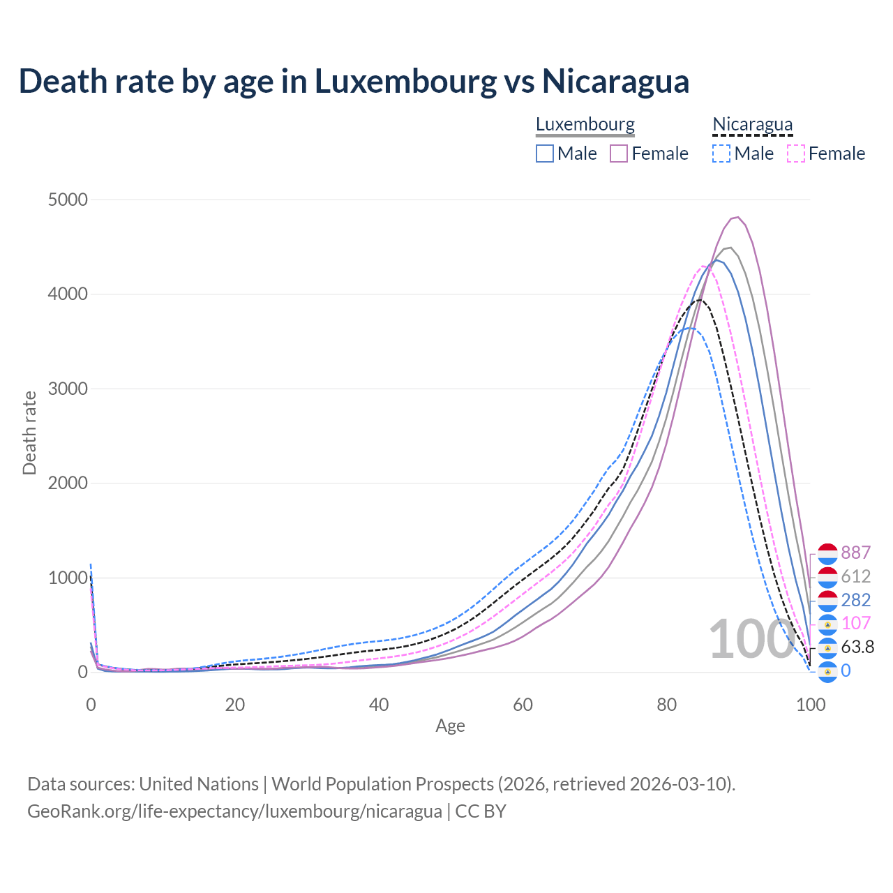 In Luxembourg, the most common age of death is 89, compared to 85 in Nicaragua. The median age of death is 85.7 in Luxembourg and 79.9 in Nicaragua, meaning only half of each cohort is expected to live past that age.