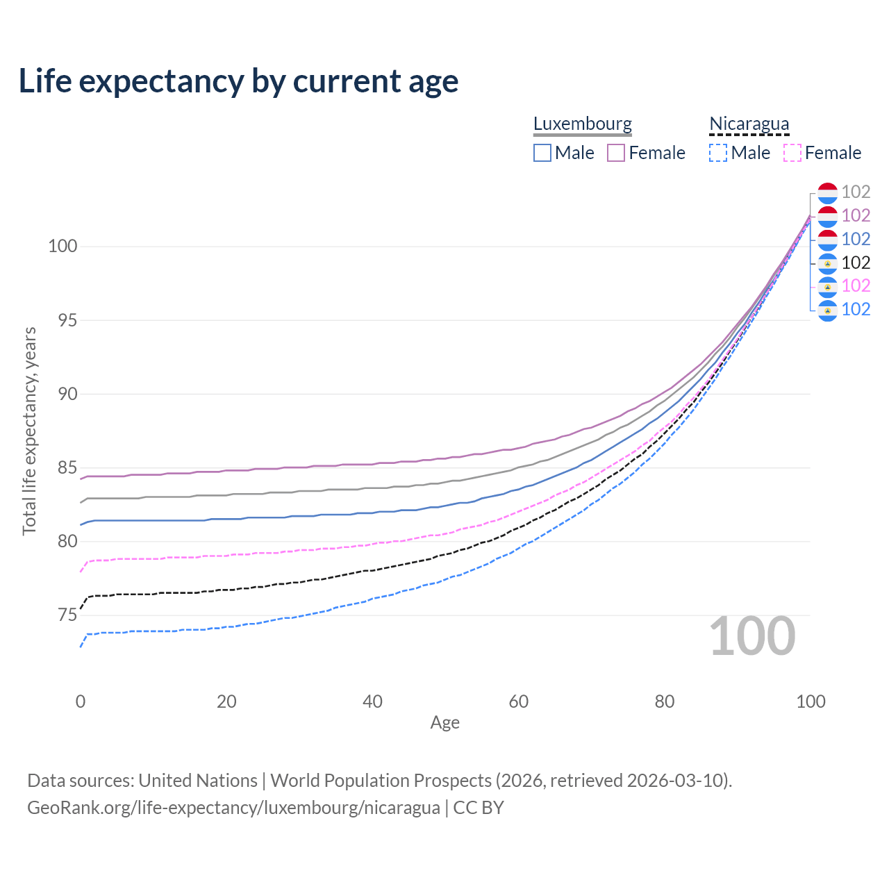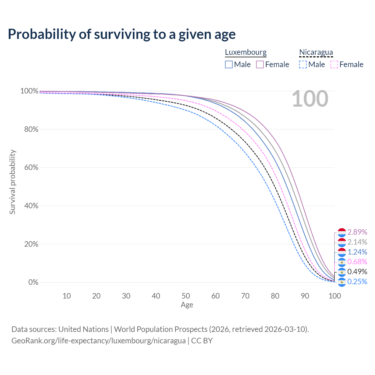 This life expectancy calculator shows the odds of living to 100, 95, 90, and below based on current age for both males and females in Luxembourg and Nicaragua, along with mean and median age of death. The calculations are based on the 2026 life tables (actuarial tables) from the UN World Population Prospects.