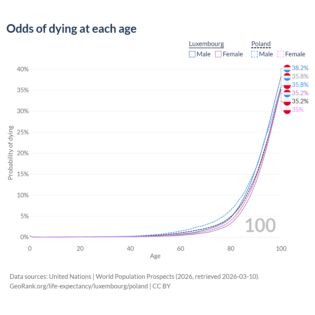 This life expectancy calculator shows the odds of living to 100, 95, 90, and below based on current age for both males and females in Luxembourg and Poland, along with mean and median age of death. The calculations are based on the 2026 life tables (actuarial tables) from the UN World Population Prospects.