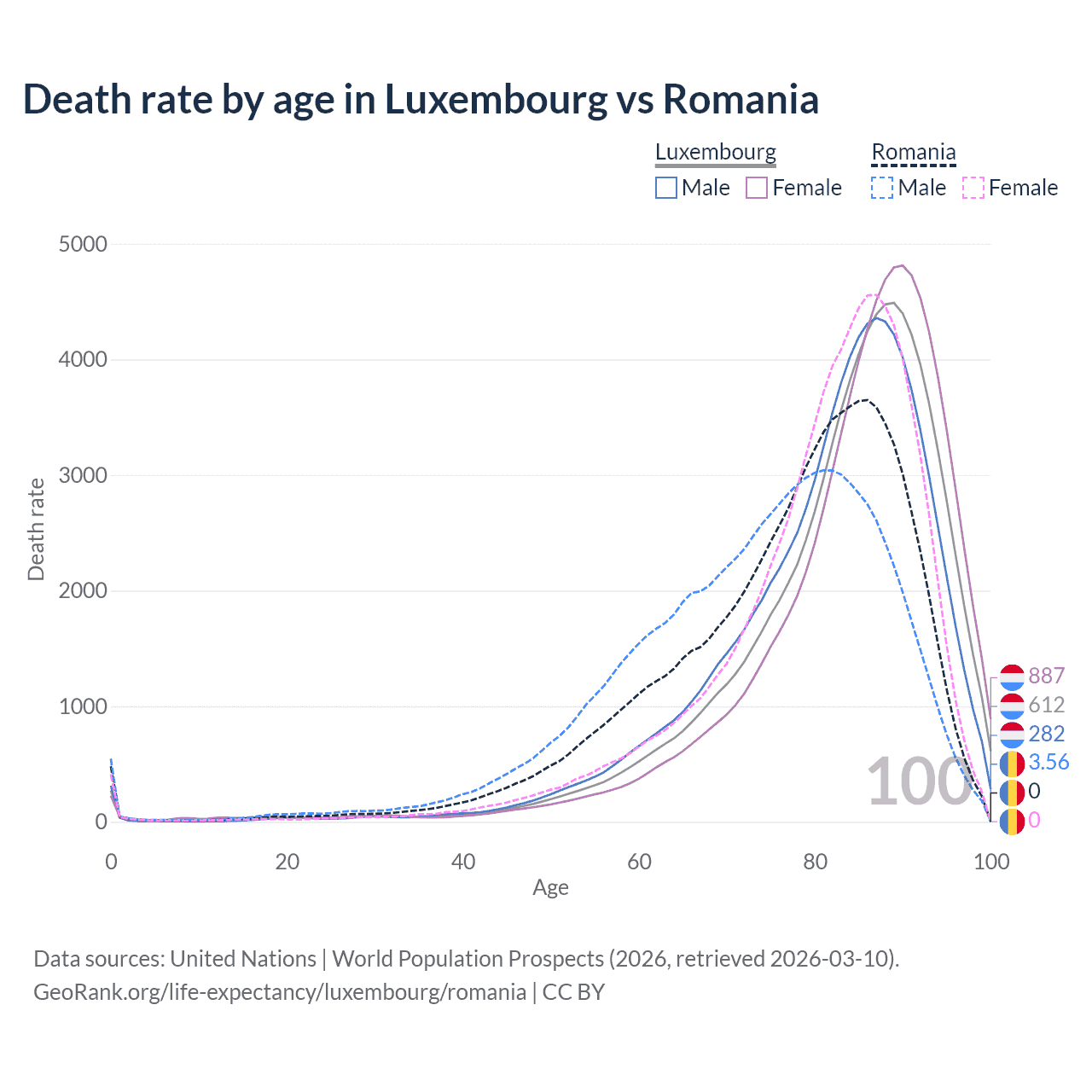 In Luxembourg, the most common age of death is 89, compared to 86 in Romania. The median age of death is 85.7 in Luxembourg and 79.9 in Romania, meaning only half of each cohort is expected to live past that age.