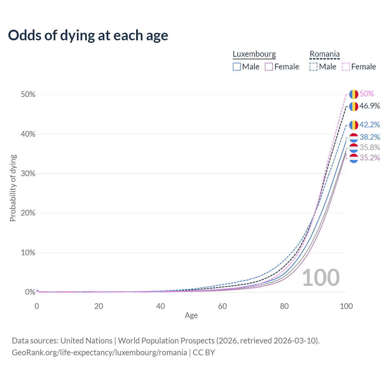 This life expectancy calculator shows the odds of living to 100, 95, 90, and below based on current age for both males and females in Luxembourg and Romania, along with mean and median age of death. The calculations are based on the 2026 life tables (actuarial tables) from the UN World Population Prospects.