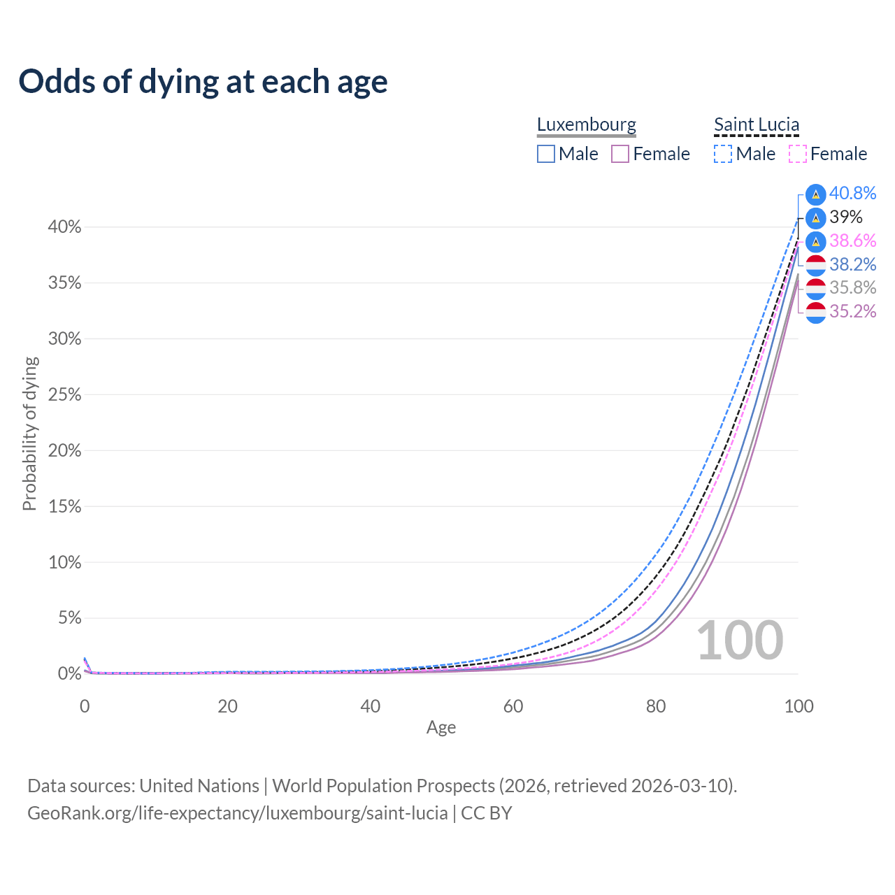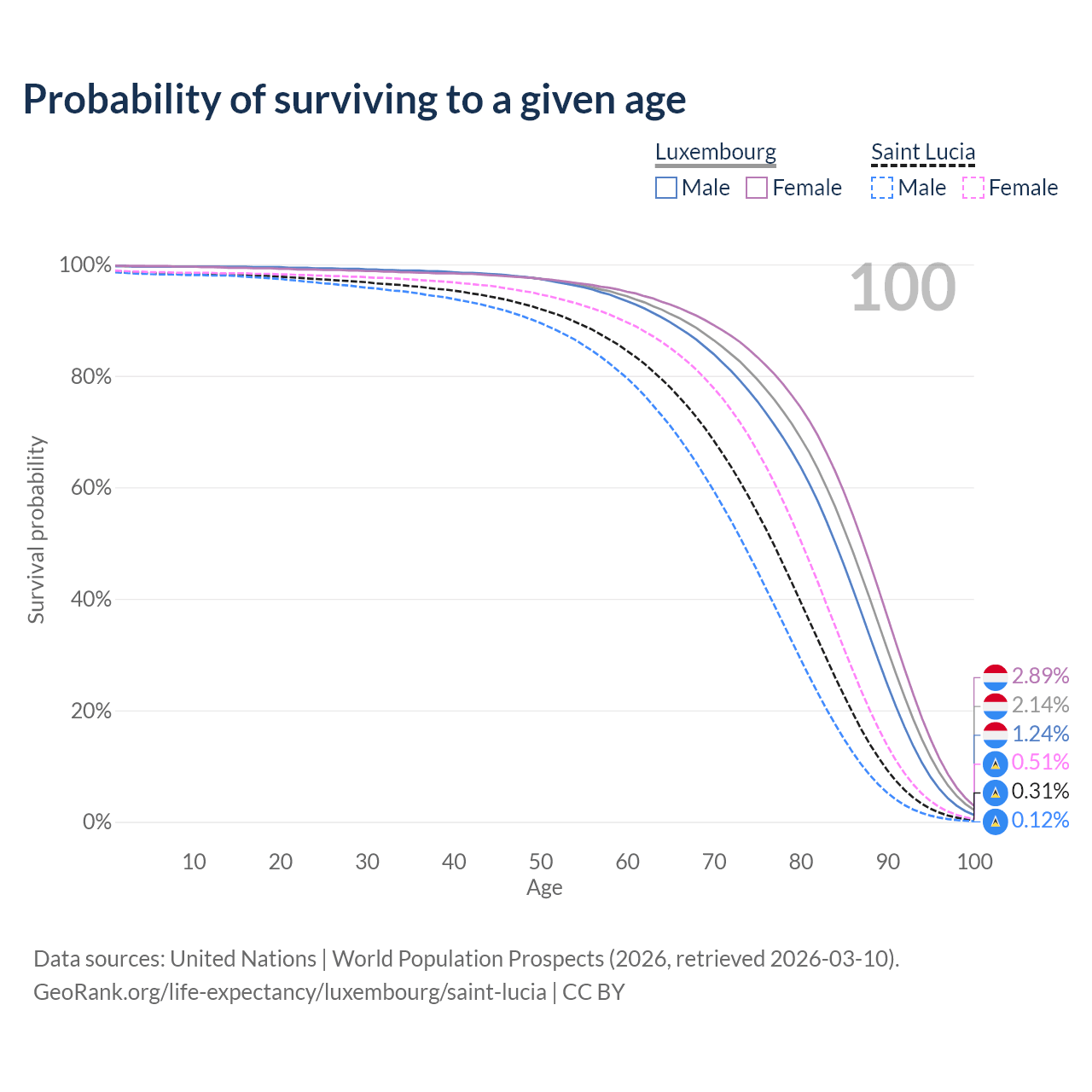 This life expectancy calculator shows the odds of living to 100, 95, 90, and below based on current age for both males and females in Luxembourg and Saint Lucia, along with mean and median age of death. The calculations are based on the 2026 life tables (actuarial tables) from the UN World Population Prospects.