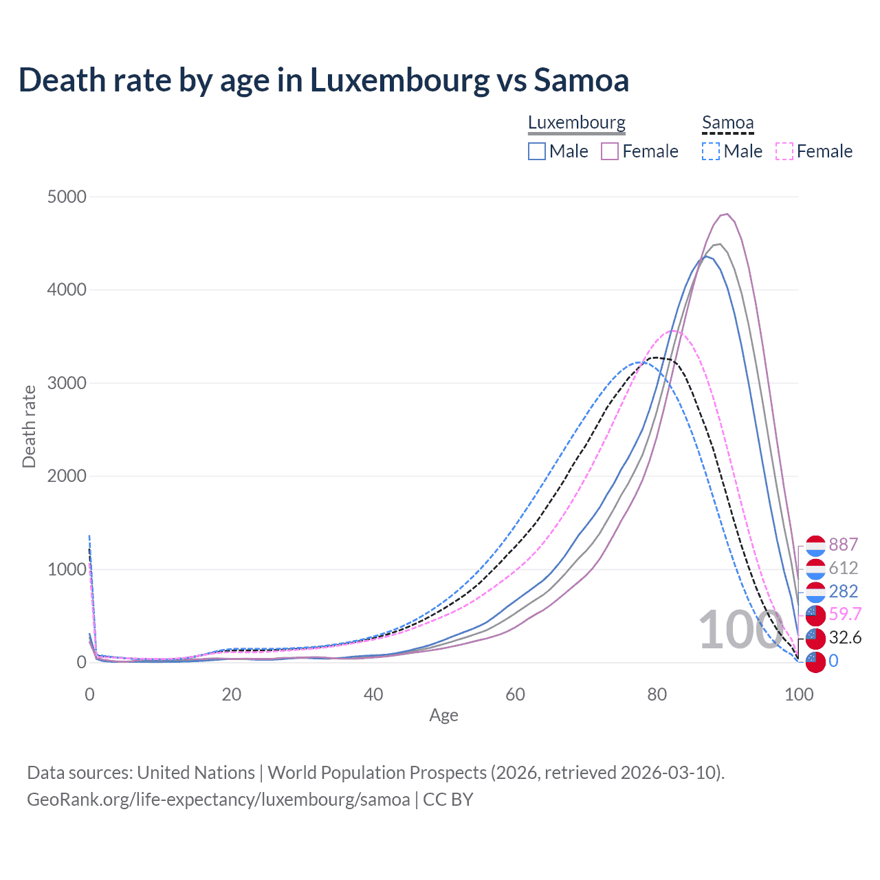 In Luxembourg, the most common age of death is 89, compared to 80 in Samoa. The median age of death is 85.7 in Luxembourg and 75.9 in Samoa, meaning only half of each cohort is expected to live past that age.