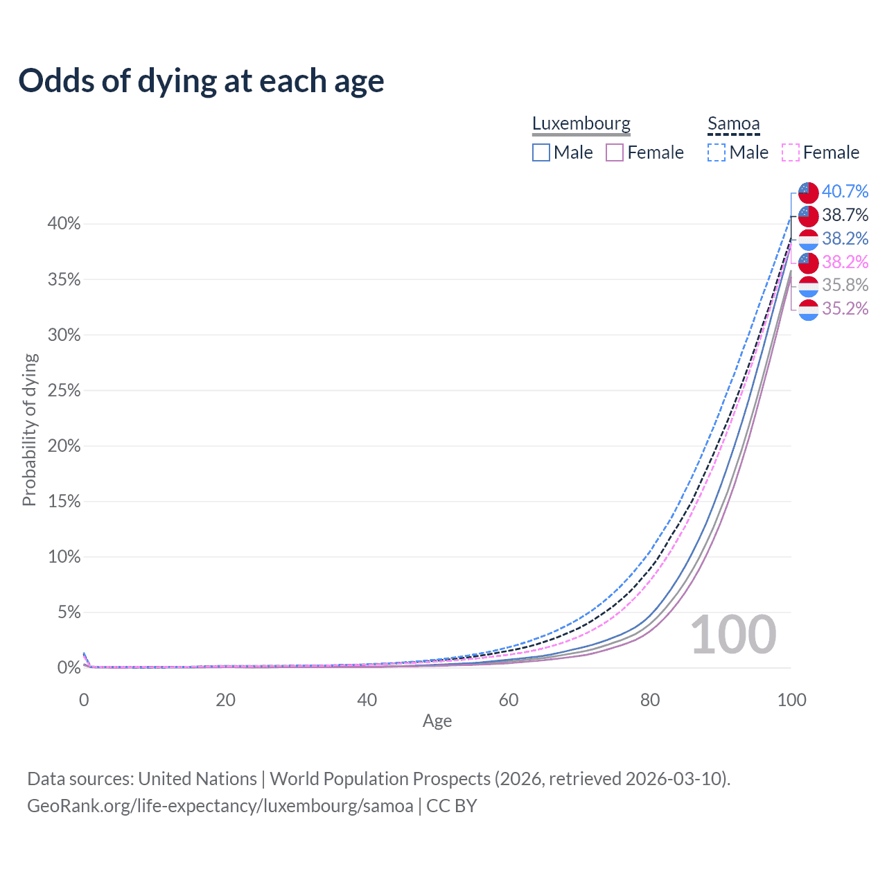 This life expectancy calculator shows the odds of living to 100, 95, 90, and below based on current age for both males and females in Luxembourg and Samoa, along with mean and median age of death. The calculations are based on the 2026 life tables (actuarial tables) from the UN World Population Prospects.
